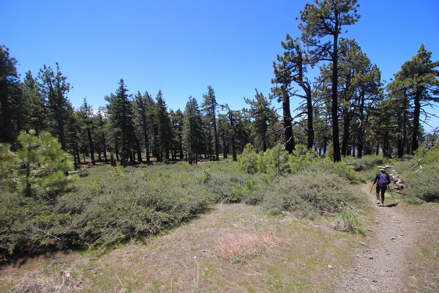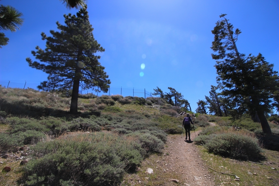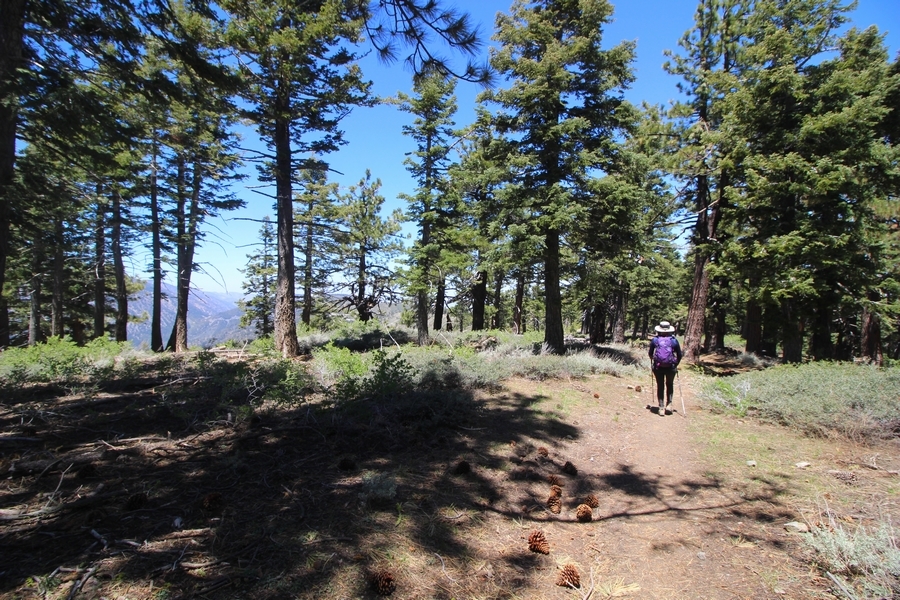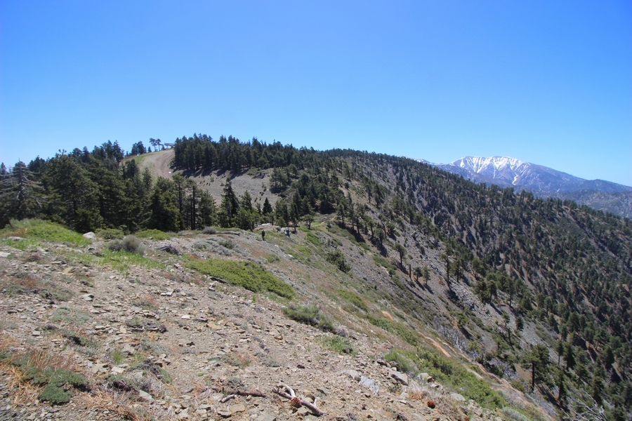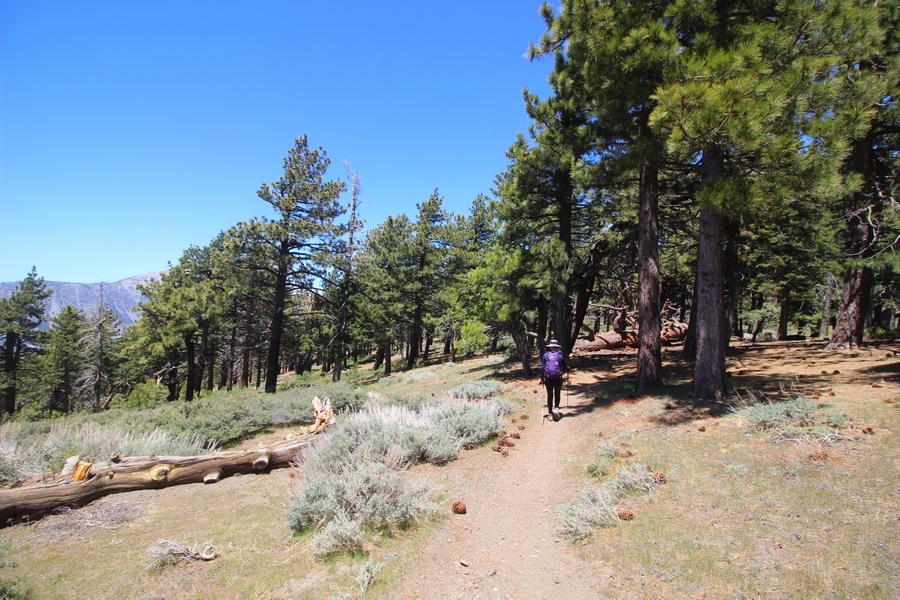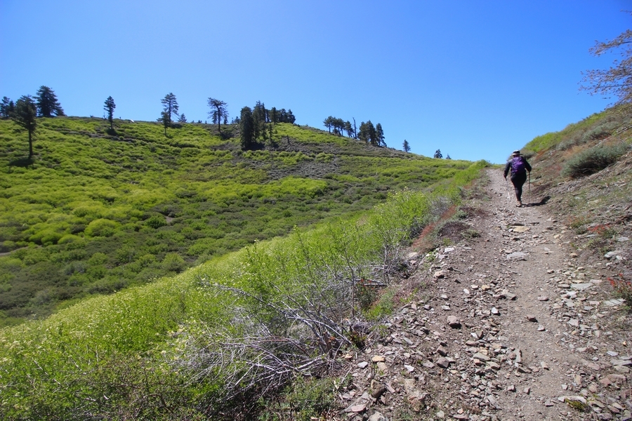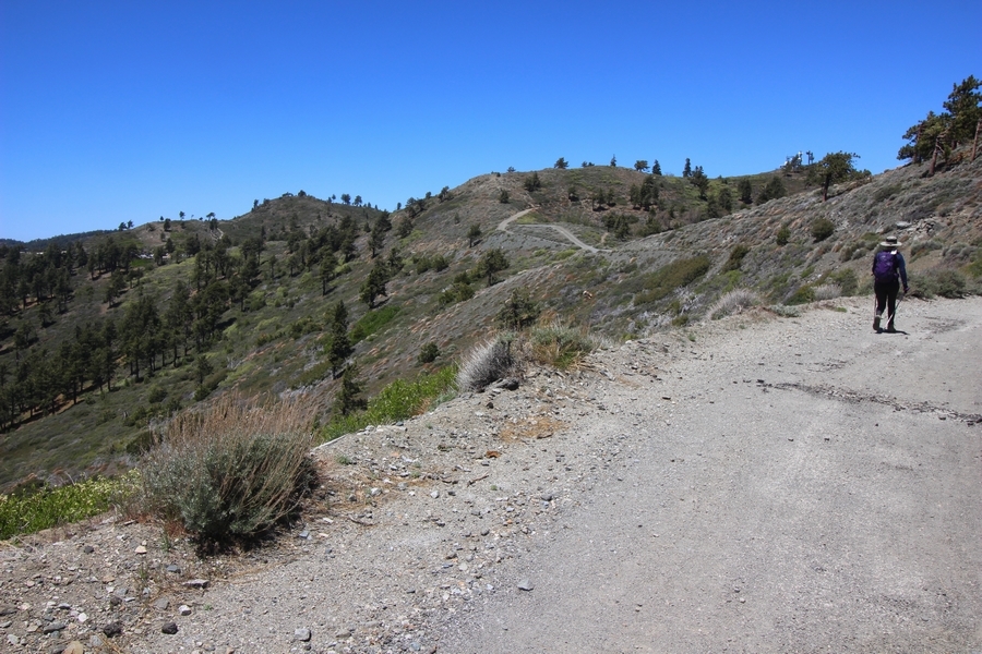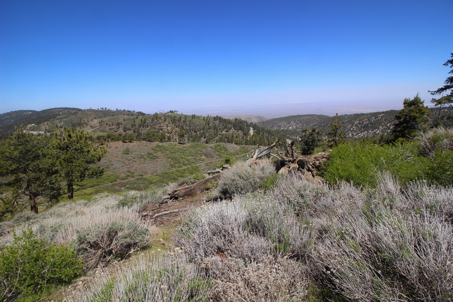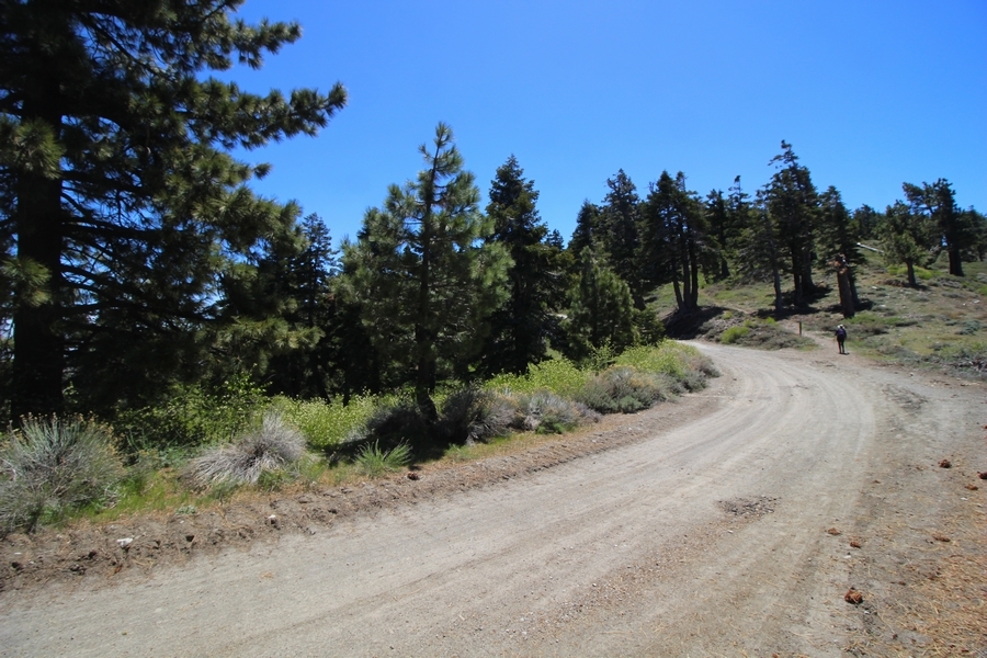 We both woke up a bit sore from our outing yesterday, but we wanted to get a hike in anyway, if for no other reason than to get stiff muscles loosened up. We settled on going up the Blue Ridge trail near Mountain High, but by the time we got to the trailhead, it was full of cars and there was a large group get organized to start up the trail. We drove up Hwy 2, hoping that the road was open down to Vincent Gap so we could walk out to the Bighorn gold mine – no such luck, as the highway was gated at Grassy Hollow. So, we turned around and parked at Inspiration Point – there were several cars in the lot servicing the PCT westbound but only a couple more parked on the east side. We quickly determined to repeat another hike from 2015, a walk up the PCT to Blue Ridge campground, a little over two miles distant with 700′ of gain. We headed out right away, first breezing through a level section for about half a mile before starting a moderate climb through a shady grove of mountain oaks, followed by an open climb that got steeper the further we went – the open part in particular would have been quite warm were it not for a cool breeze that actually had us bundled up a bit despite the sunny day. The trail leveled off for a bit as we passed along the southern boundary of Mountain High’s west resort, after which we dropped into a shallow saddle followed by a significantly steeper slog up the ridge to the top of the resort. One more short descent followed by a longer uphill pitch brought us to the high point of the day, a softly rounded knob just west of the campground at 2 miles in. Here, we started seeing more people, having had the trail mostly to ourselves on the way up – while those on the PCT had kept their distance, folks here seemed less conscientious about social distancing and most had no masks. We kept our distance from the larger knots of hikers and found an unoccupied table somewhat removed on the east edge of the camping area, where we sat for about 15 minutes and ate a couple of Lenny and Larry’s Complete Cookies – good stuff. After we recrossed the high knob on the way back, we came to the Blue Ridge road – we could see another large, slower group ahead of us uphill on the trail, so we opted to walk the road back (actually a longer option than the trail, but more consistently graded – weird for us to prefer the road, though it turned out to be pleasant and largely vacant). We followed the road westward, meandering through the ski area (where some sizable snow patches remained) before dropping down to the last and very flat half mile, ultimately reaching Inspiration Point. The return walk verified for us that some brush we had found encroaching on the road a couple of summers ago has been cut back, such that we may try and drive up some time this summer to the road’s end at Guffy campground in order to hike some other remote locations at that end of the ridge.