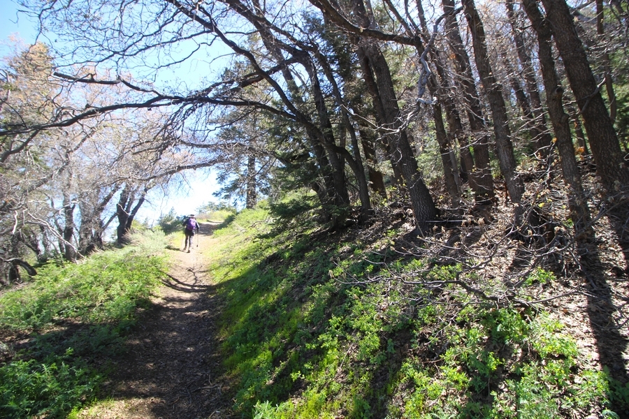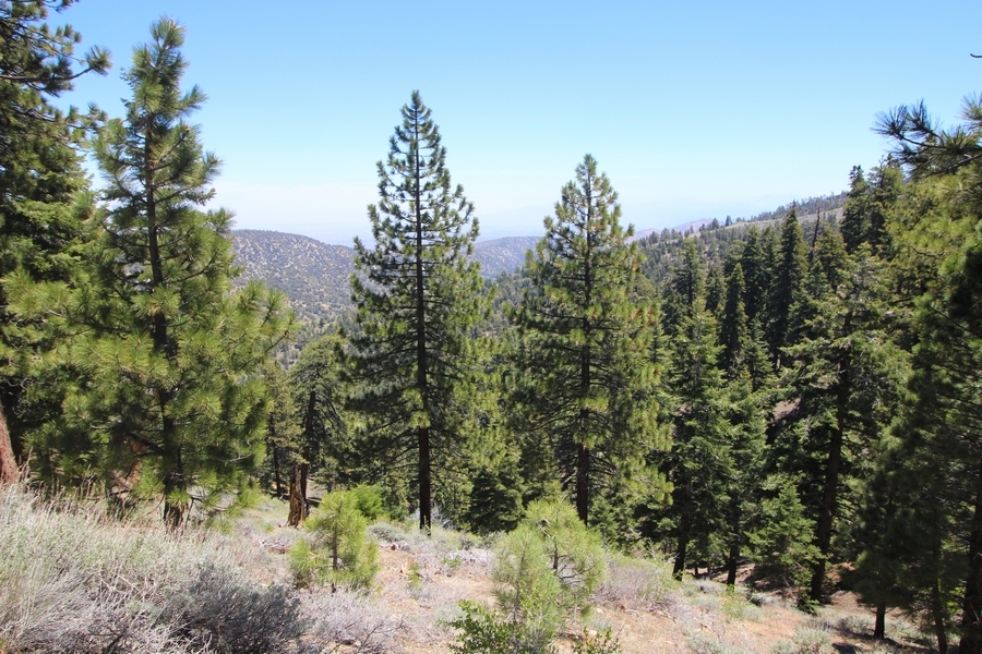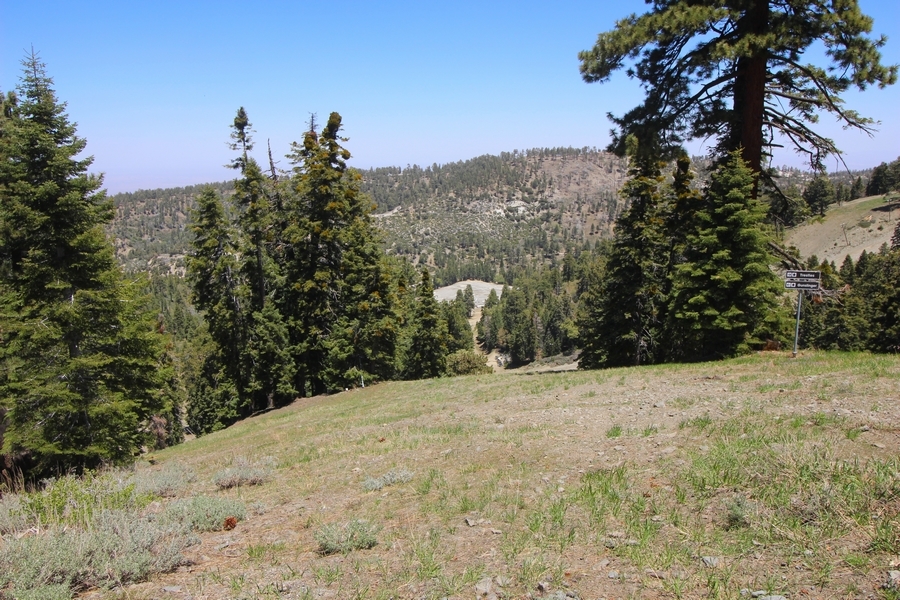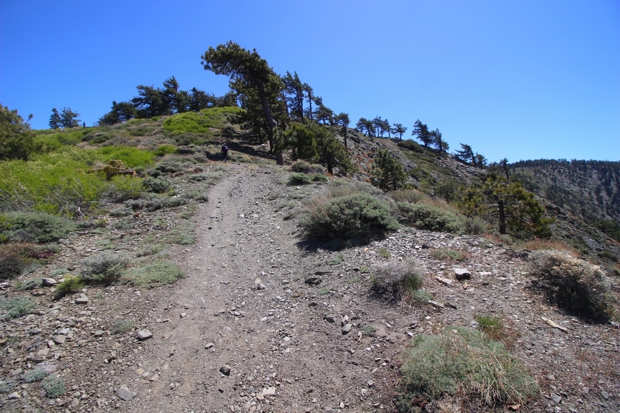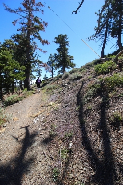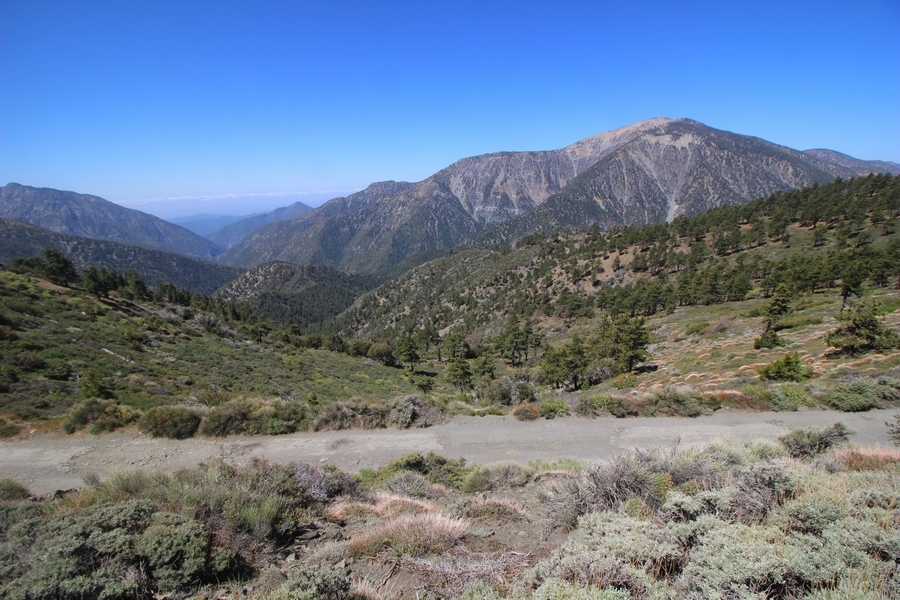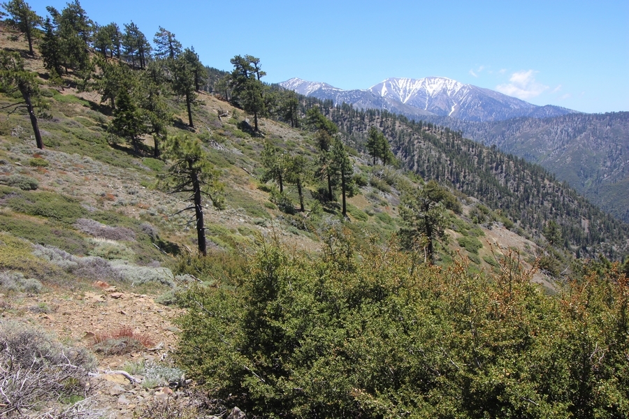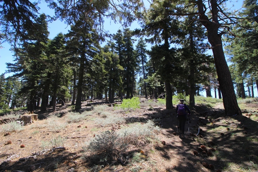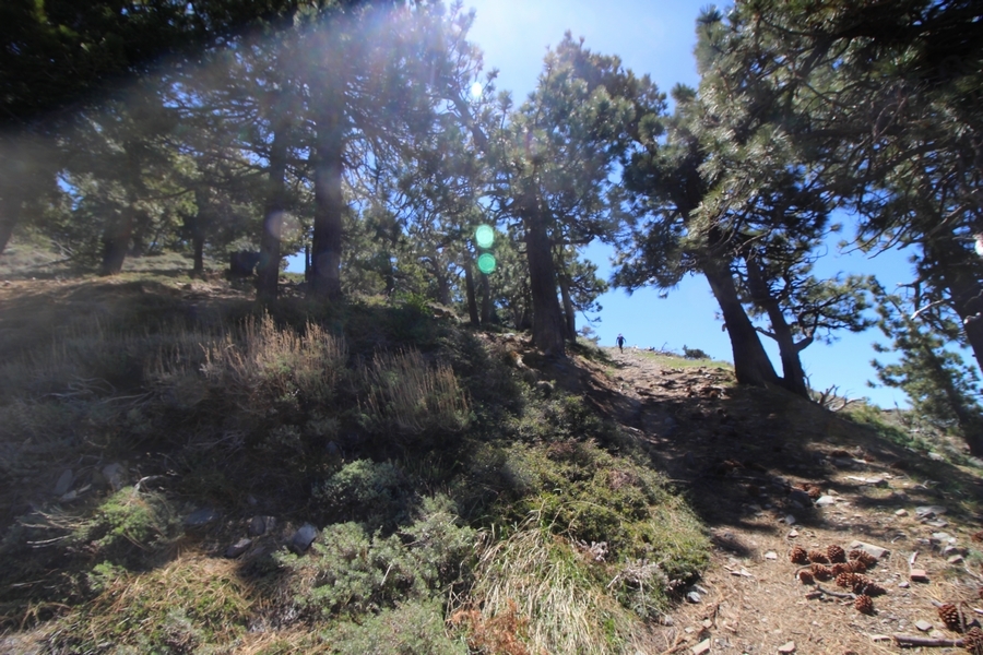 We both woke up a bit sore from our outing yesterday, but we wanted to get a hike in anyway, if for no other reason than to get stiff muscles loosened up. We settled on going up the Blue Ridge trail near Mountain High, but by the time we got to the trailhead, it was full of cars and there was a large group get organized to start up the trail. We drove up Hwy 2, hoping that the road was open down to Vincent Gap so we could walk out to the Bighorn gold mine – no such luck, as the highway was gated at Grassy Hollow. So, we turned around and parked at Inspiration Point – there were several cars in the lot servicing the PCT westbound but only a couple more parked on the east side. We quickly determined to repeat another hike from 2015, a walk up the PCT to Blue Ridge campground, a little over two miles distant with 700′ of gain. We headed out right away, first breezing through a level section for about half a mile before starting a moderate climb through a shady grove of mountain oaks, followed by an open climb that got steeper the further we went – the open part in particular would have been quite warm were it not for a cool breeze that actually had us bundled up a bit despite the sunny day. The trail leveled off for a bit as we passed along the southern boundary of Mountain High’s west resort, after which we dropped into a shallow saddle followed by a significantly steeper slog up the ridge to the top of the resort. One more short descent followed by a longer uphill pitch brought us to the high point of the day, a softly rounded knob just west of the campground at 2 miles in. Here, we started seeing more people, having had the trail mostly to ourselves on the way up – while those on the PCT had kept their distance, folks here seemed less conscientious about social distancing and most had no masks. We kept our distance from the larger knots of hikers and found an unoccupied table somewhat removed on the east edge of the camping area, where we sat for about 15 minutes and ate a couple of Lenny and Larry’s Complete Cookies – good stuff. After we recrossed the high knob on the way back, we came to the Blue Ridge road – we could see another large, slower group ahead of us uphill on the trail, so we opted to walk the road back (actually a longer option than the trail, but more consistently graded – weird for us to prefer the road, though it turned out to be pleasant and largely vacant). We followed the road westward, meandering through the ski area (where some sizable snow patches remained) before dropping down to the last and very flat half mile, ultimately reaching Inspiration Point. The return walk verified for us that some brush we had found encroaching on the road a couple of summers ago has been cut back, such that we may try and drive up some time this summer to the road’s end at Guffy campground in order to hike some other remote locations at that end of the ridge.