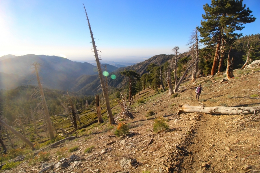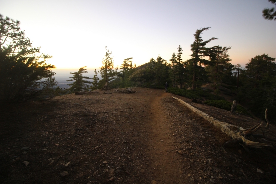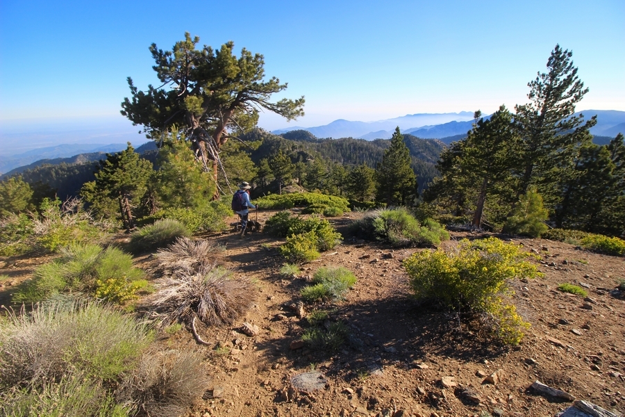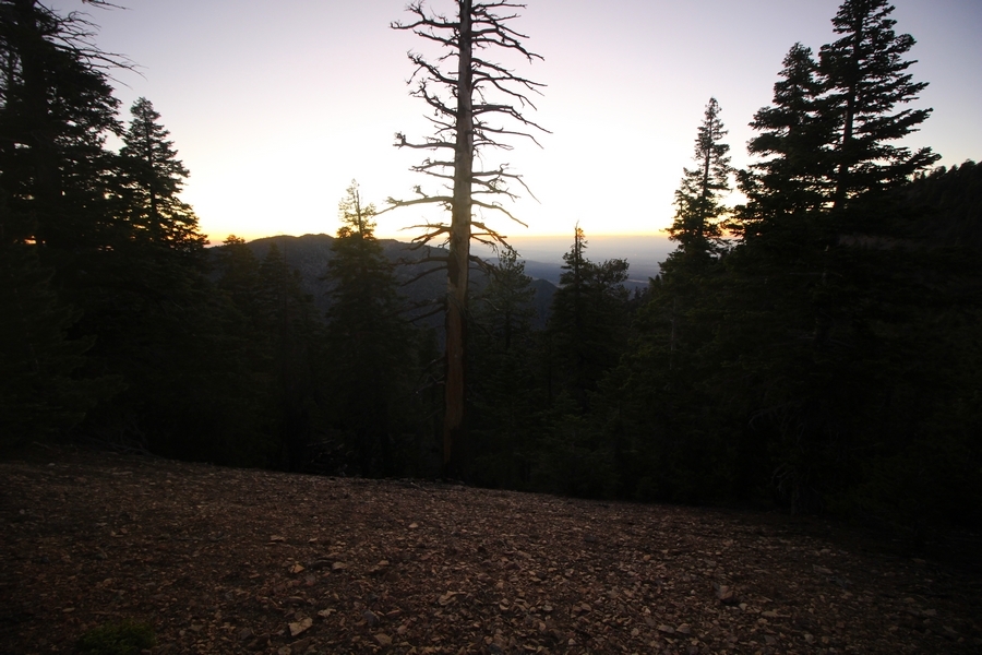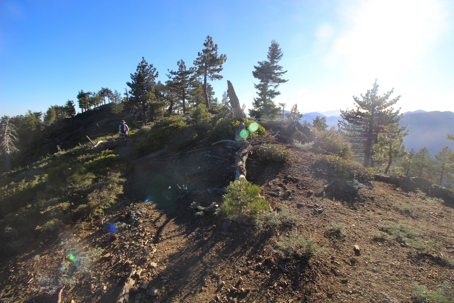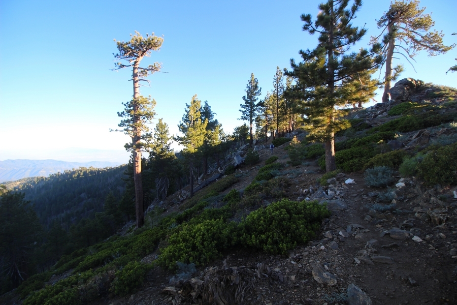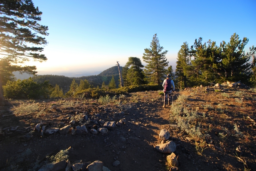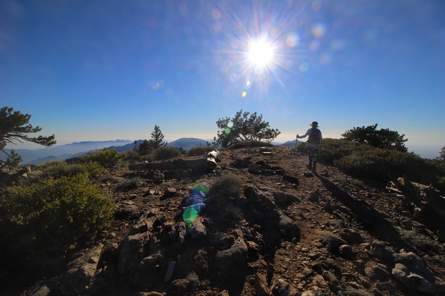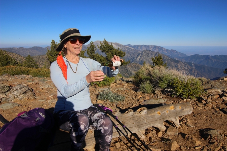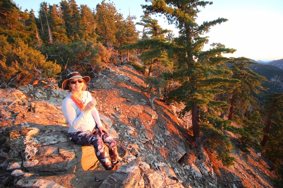 Given Chris’ questionable performance at Tyee Lakes the previous weekend, it wasn’t at all surprising that his personal trainer and life coach (one might hazard a guess as to who that is) immediately put him on a strenuous program of diet and exercise. Since it was Jane’s birthday, Chris humored her with a repeat of our last visit to Throop Peak in 2017 – our first idea here was to just walk up the ridge to where we could watch the sunset while Jane enjoyed a celebratory glass of wine, but we decided we could grab sandwiches at Jensen’s in Wrightwood and head first to the peak before returning to our sunset spot. Although really quite moderate, the trail up from Dawson Saddle always surprises with how much it seems to gain – Chris huffed and puffed his way up the ridgeline, but the pace was comfortable enough and we reached the summit 2 miles and 1,200 vertical feet later in a little over an hour. The evening weather was wonderful, sunny but with enough of a breeze to make Chris reach for his puffy once on top. Jane had brought a couple of mini-bottles of wine (in plastic bottles, no less), and she enjoyed her (first) birthday glass of chardonnay at 9,117′ of elevation. We still had about 90 minutes until sunset and Jane didn’t want to return to our watch spot and just sit, so she determined we should continue on down the crest to Mt. Hawkins – before Chris could comment, she was off, heading southwest down the use trail off the summit. We quickly reached the PCT and, following it southward, we reached a large and very dead ponderosa pine that had fallen lopsidedly across the trail – again, Jane was up and over the thing before Chris could protest that this obstacle might slow us down enough to miss the sunset. Once over the dead tree, we covered the remaining half-mile to Mt. Hawkins in about 10 minutes and, once there, spent about 30 seconds on the summit before Jane decided we had better hurry if we wanted to get back to watch the sunset (hmm). So, up the PCT we rushed, re-crossing over the deadfall and following the familiar trail east and north around Throop, rejoining the Dawson Saddle trail and continuing northward down the ridge. Now the choice became where to stop for the best sunset views – the highest spot on the ridge Chris had suggested would be great in the fall when the sun is further south in the sky, but now, while the sun would be setting over Mt. Williamson to the west, the view wasn’t so great from here. We picked up the pace again, hurrying down the trail another 1/4-mile to a rocky outcrop – arriving just at the golden hour, we got to see alpenglow catch all along the ridge followed by a clear, cloudless sunset. Afterward, we still had over a mile to get back to the car, and we actually used headlamps over the last few hundred yards back to the trailhead. Given the heat of the day this time of year, even in this area that’s relatively high elevation, the evening has gotten our attention as being an ideal time to hike.