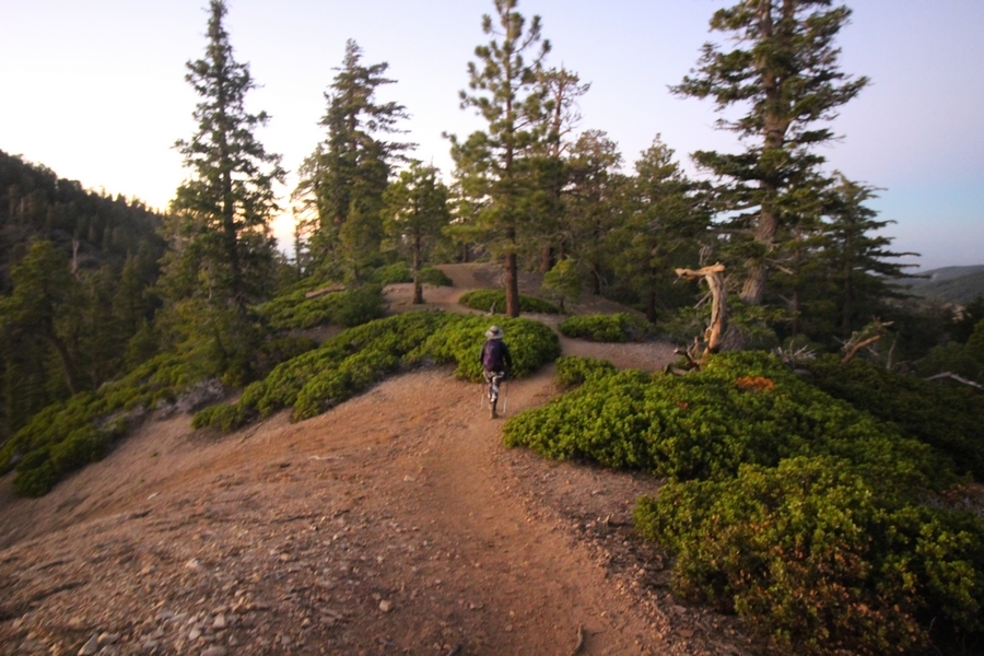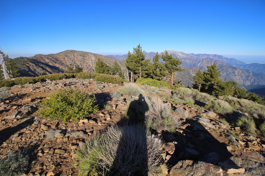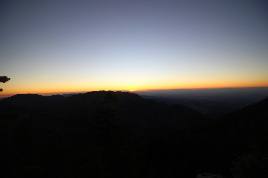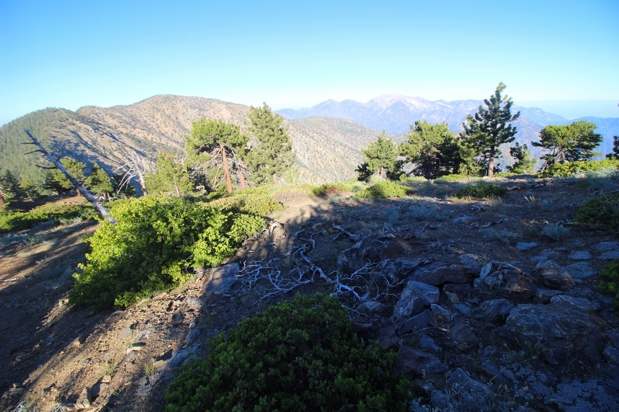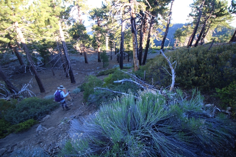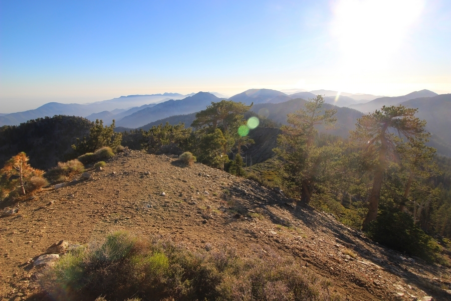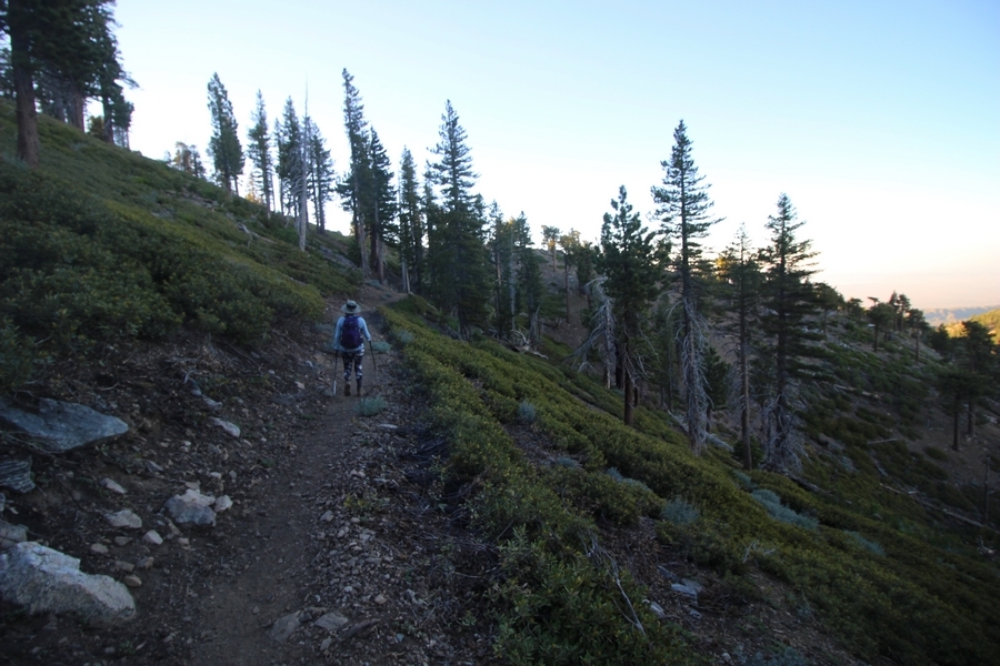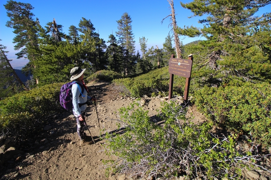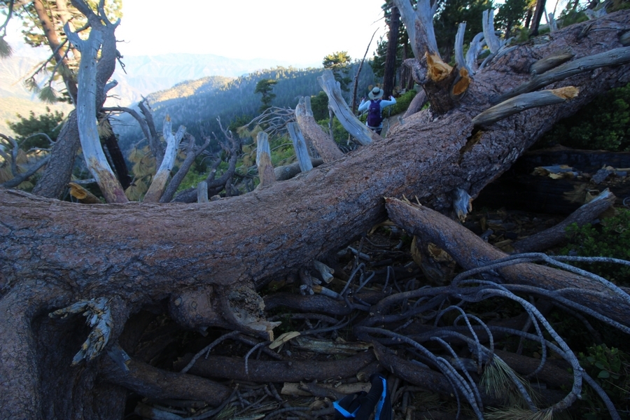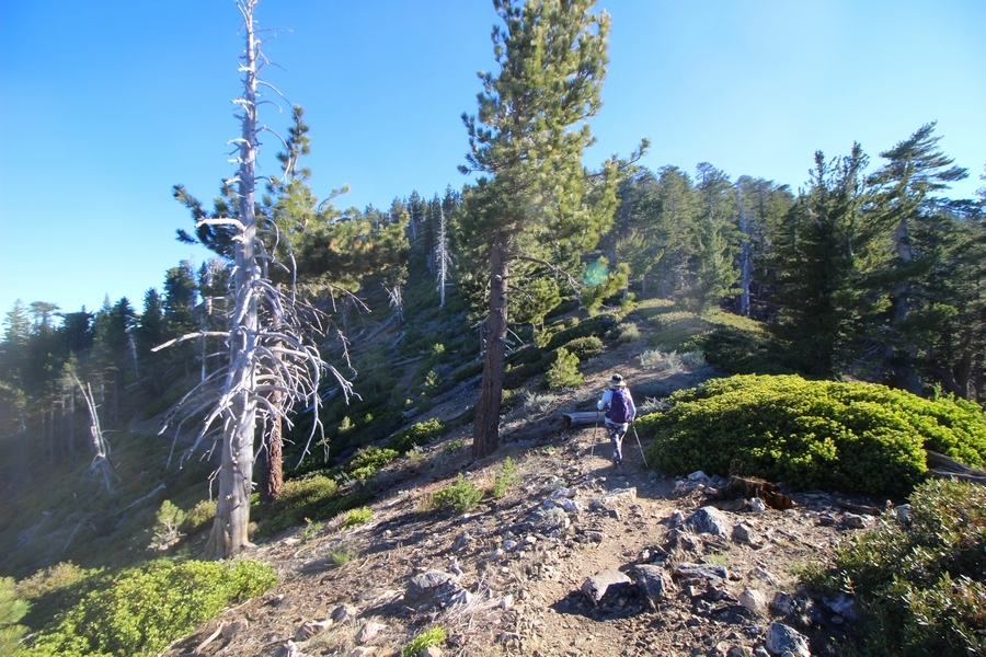 Given Chris’ questionable performance at Tyee Lakes the previous weekend, it wasn’t at all surprising that his personal trainer and life coach (one might hazard a guess as to who that is) immediately put him on a strenuous program of diet and exercise. Since it was Jane’s birthday, Chris humored her with a repeat of our last visit to Throop Peak in 2017 – our first idea here was to just walk up the ridge to where we could watch the sunset while Jane enjoyed a celebratory glass of wine, but we decided we could grab sandwiches at Jensen’s in Wrightwood and head first to the peak before returning to our sunset spot. Although really quite moderate, the trail up from Dawson Saddle always surprises with how much it seems to gain – Chris huffed and puffed his way up the ridgeline, but the pace was comfortable enough and we reached the summit 2 miles and 1,200 vertical feet later in a little over an hour. The evening weather was wonderful, sunny but with enough of a breeze to make Chris reach for his puffy once on top. Jane had brought a couple of mini-bottles of wine (in plastic bottles, no less), and she enjoyed her (first) birthday glass of chardonnay at 9,117′ of elevation. We still had about 90 minutes until sunset and Jane didn’t want to return to our watch spot and just sit, so she determined we should continue on down the crest to Mt. Hawkins – before Chris could comment, she was off, heading southwest down the use trail off the summit. We quickly reached the PCT and, following it southward, we reached a large and very dead ponderosa pine that had fallen lopsidedly across the trail – again, Jane was up and over the thing before Chris could protest that this obstacle might slow us down enough to miss the sunset. Once over the dead tree, we covered the remaining half-mile to Mt. Hawkins in about 10 minutes and, once there, spent about 30 seconds on the summit before Jane decided we had better hurry if we wanted to get back to watch the sunset (hmm). So, up the PCT we rushed, re-crossing over the deadfall and following the familiar trail east and north around Throop, rejoining the Dawson Saddle trail and continuing northward down the ridge. Now the choice became where to stop for the best sunset views – the highest spot on the ridge Chris had suggested would be great in the fall when the sun is further south in the sky, but now, while the sun would be setting over Mt. Williamson to the west, the view wasn’t so great from here. We picked up the pace again, hurrying down the trail another 1/4-mile to a rocky outcrop – arriving just at the golden hour, we got to see alpenglow catch all along the ridge followed by a clear, cloudless sunset. Afterward, we still had over a mile to get back to the car, and we actually used headlamps over the last few hundred yards back to the trailhead. Given the heat of the day this time of year, even in this area that’s relatively high elevation, the evening has gotten our attention as being an ideal time to hike.