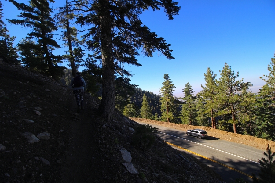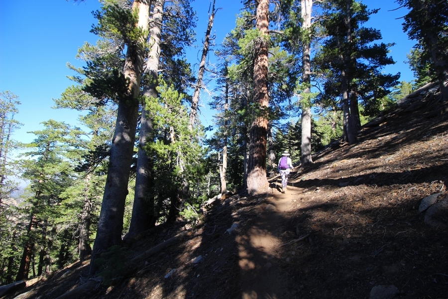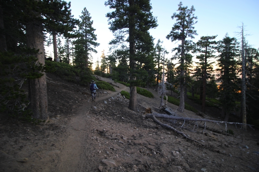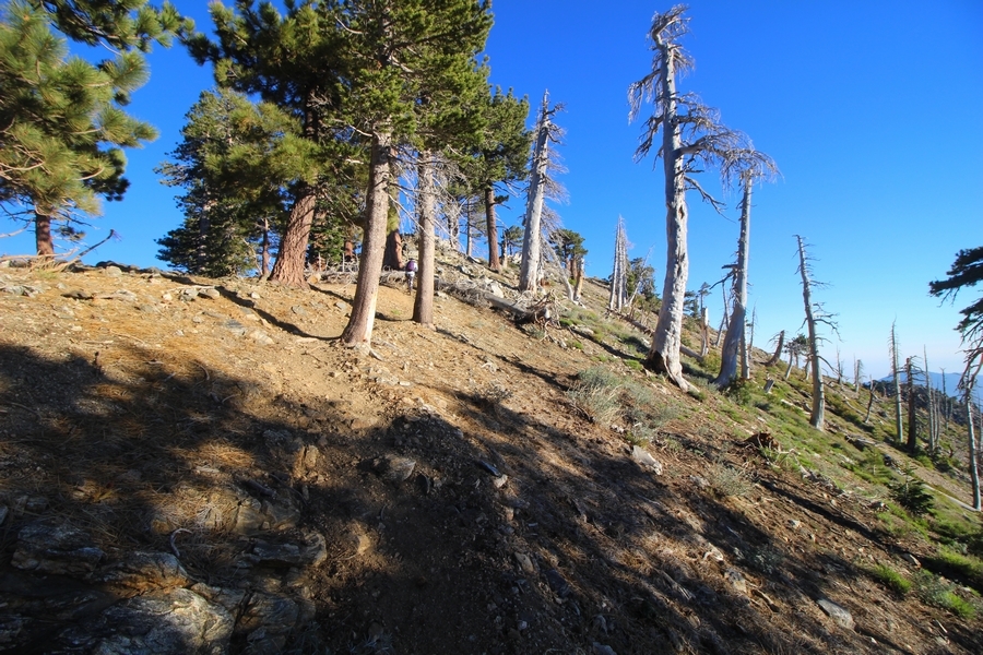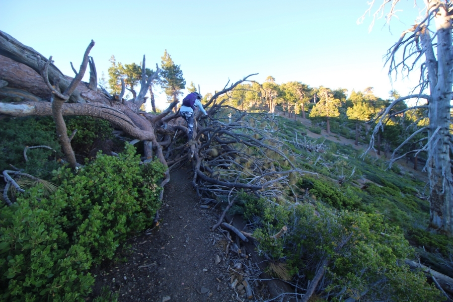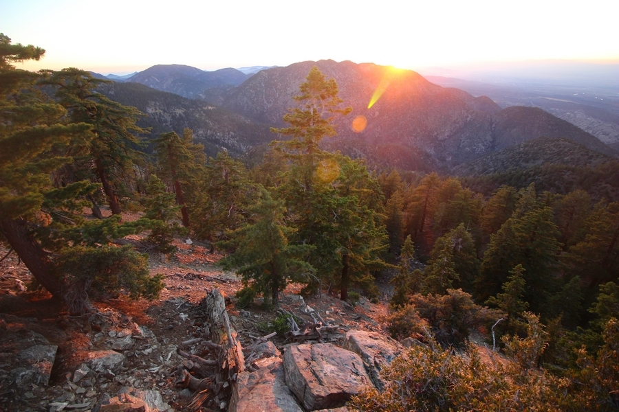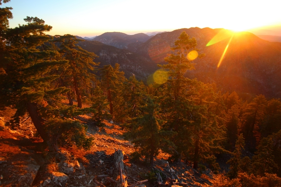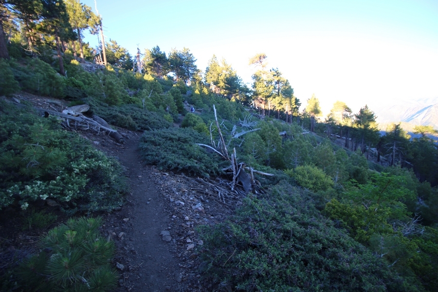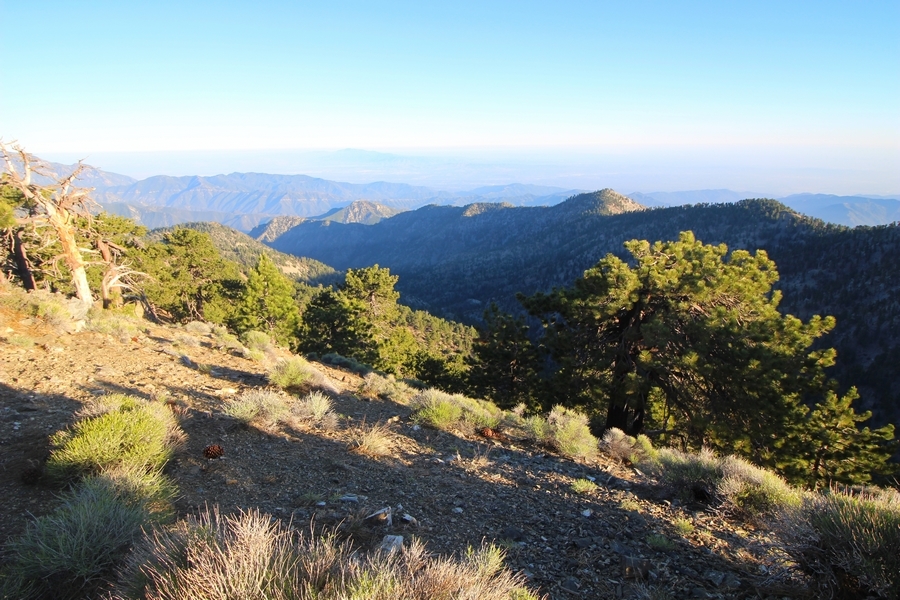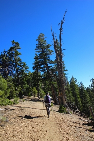 Given Chris’ questionable performance at Tyee Lakes the previous weekend, it wasn’t at all surprising that his personal trainer and life coach (one might hazard a guess as to who that is) immediately put him on a strenuous program of diet and exercise. Since it was Jane’s birthday, Chris humored her with a repeat of our last visit to Throop Peak in 2017 – our first idea here was to just walk up the ridge to where we could watch the sunset while Jane enjoyed a celebratory glass of wine, but we decided we could grab sandwiches at Jensen’s in Wrightwood and head first to the peak before returning to our sunset spot. Although really quite moderate, the trail up from Dawson Saddle always surprises with how much it seems to gain – Chris huffed and puffed his way up the ridgeline, but the pace was comfortable enough and we reached the summit 2 miles and 1,200 vertical feet later in a little over an hour. The evening weather was wonderful, sunny but with enough of a breeze to make Chris reach for his puffy once on top. Jane had brought a couple of mini-bottles of wine (in plastic bottles, no less), and she enjoyed her (first) birthday glass of chardonnay at 9,117′ of elevation. We still had about 90 minutes until sunset and Jane didn’t want to return to our watch spot and just sit, so she determined we should continue on down the crest to Mt. Hawkins – before Chris could comment, she was off, heading southwest down the use trail off the summit. We quickly reached the PCT and, following it southward, we reached a large and very dead ponderosa pine that had fallen lopsidedly across the trail – again, Jane was up and over the thing before Chris could protest that this obstacle might slow us down enough to miss the sunset. Once over the dead tree, we covered the remaining half-mile to Mt. Hawkins in about 10 minutes and, once there, spent about 30 seconds on the summit before Jane decided we had better hurry if we wanted to get back to watch the sunset (hmm). So, up the PCT we rushed, re-crossing over the deadfall and following the familiar trail east and north around Throop, rejoining the Dawson Saddle trail and continuing northward down the ridge. Now the choice became where to stop for the best sunset views – the highest spot on the ridge Chris had suggested would be great in the fall when the sun is further south in the sky, but now, while the sun would be setting over Mt. Williamson to the west, the view wasn’t so great from here. We picked up the pace again, hurrying down the trail another 1/4-mile to a rocky outcrop – arriving just at the golden hour, we got to see alpenglow catch all along the ridge followed by a clear, cloudless sunset. Afterward, we still had over a mile to get back to the car, and we actually used headlamps over the last few hundred yards back to the trailhead. Given the heat of the day this time of year, even in this area that’s relatively high elevation, the evening has gotten our attention as being an ideal time to hike.
