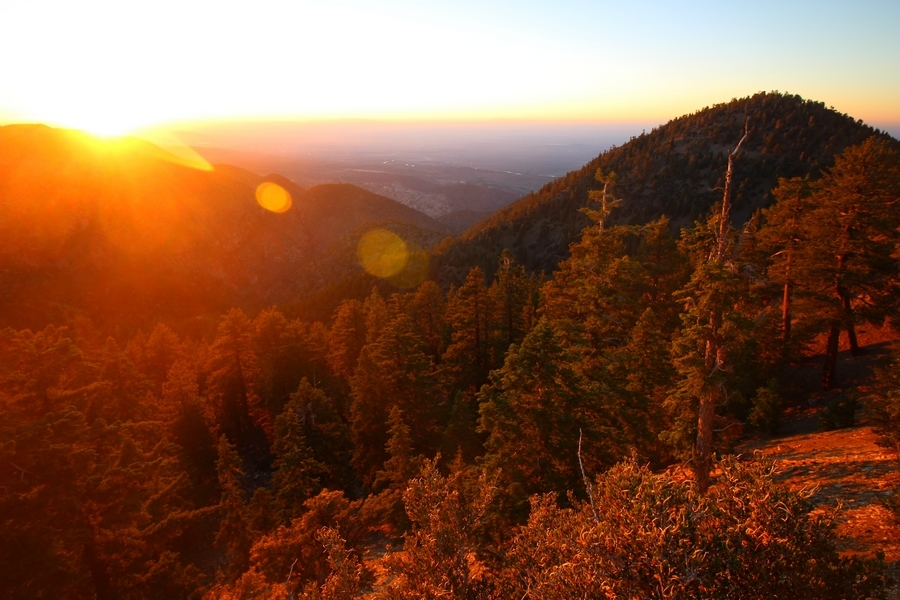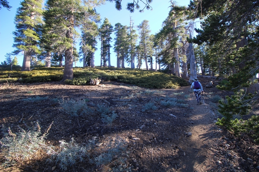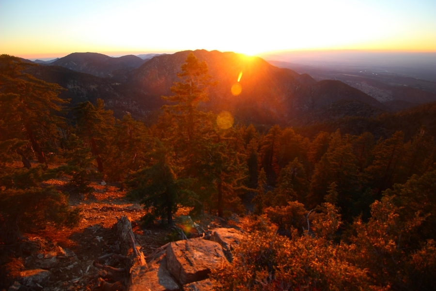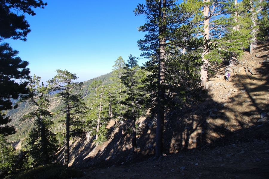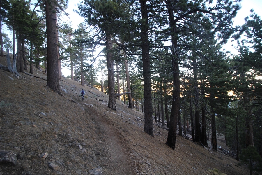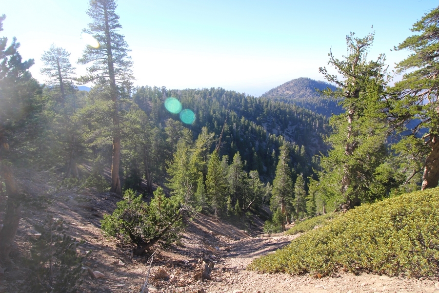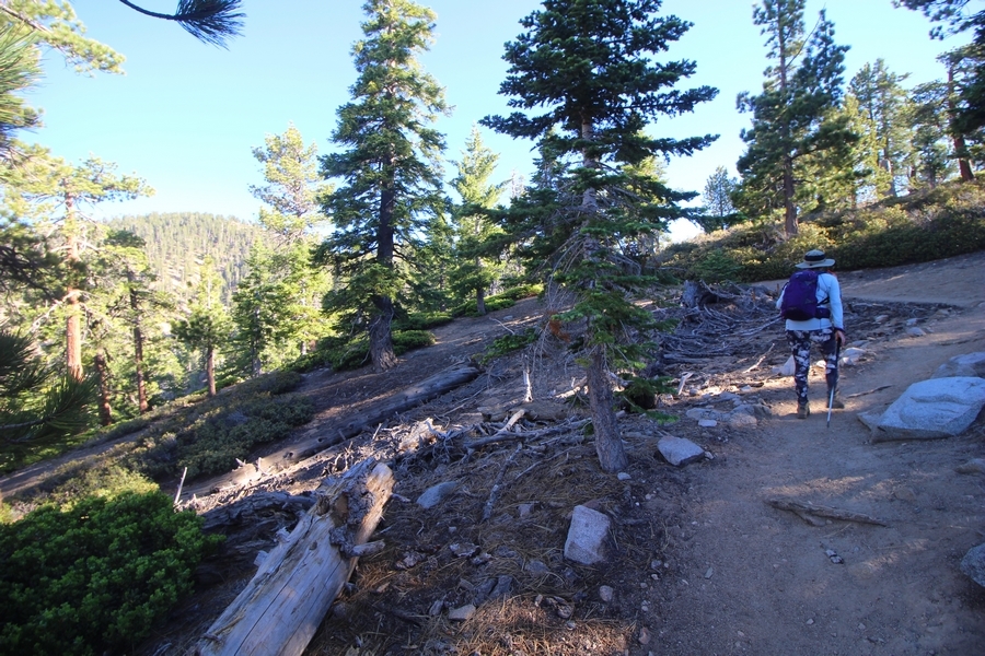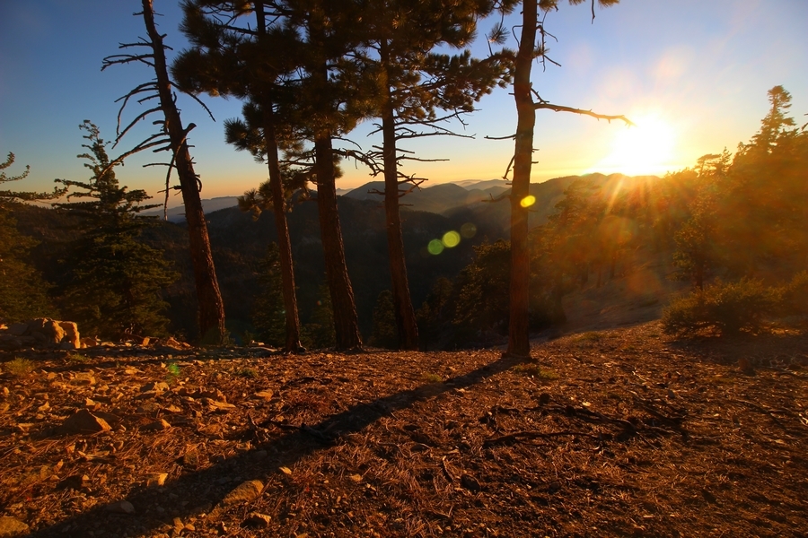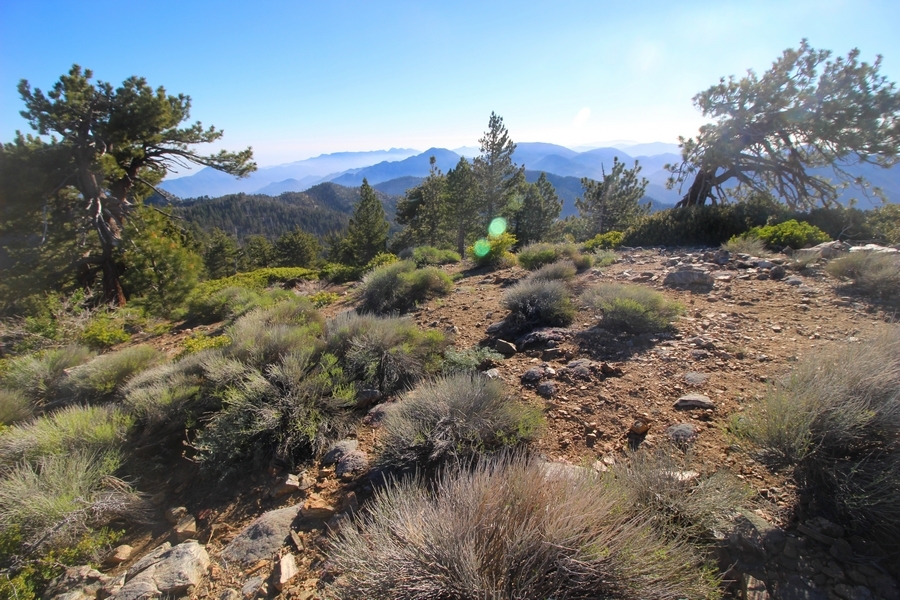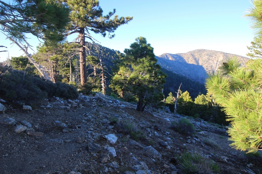 Given Chris’ questionable performance at Tyee Lakes the previous weekend, it wasn’t at all surprising that his personal trainer and life coach (one might hazard a guess as to who that is) immediately put him on a strenuous program of diet and exercise. Since it was Jane’s birthday, Chris humored her with a repeat of our last visit to Throop Peak in 2017 – our first idea here was to just walk up the ridge to where we could watch the sunset while Jane enjoyed a celebratory glass of wine, but we decided we could grab sandwiches at Jensen’s in Wrightwood and head first to the peak before returning to our sunset spot. Although really quite moderate, the trail up from Dawson Saddle always surprises with how much it seems to gain – Chris huffed and puffed his way up the ridgeline, but the pace was comfortable enough and we reached the summit 2 miles and 1,200 vertical feet later in a little over an hour. The evening weather was wonderful, sunny but with enough of a breeze to make Chris reach for his puffy once on top. Jane had brought a couple of mini-bottles of wine (in plastic bottles, no less), and she enjoyed her (first) birthday glass of chardonnay at 9,117′ of elevation. We still had about 90 minutes until sunset and Jane didn’t want to return to our watch spot and just sit, so she determined we should continue on down the crest to Mt. Hawkins – before Chris could comment, she was off, heading southwest down the use trail off the summit. We quickly reached the PCT and, following it southward, we reached a large and very dead ponderosa pine that had fallen lopsidedly across the trail – again, Jane was up and over the thing before Chris could protest that this obstacle might slow us down enough to miss the sunset. Once over the dead tree, we covered the remaining half-mile to Mt. Hawkins in about 10 minutes and, once there, spent about 30 seconds on the summit before Jane decided we had better hurry if we wanted to get back to watch the sunset (hmm). So, up the PCT we rushed, re-crossing over the deadfall and following the familiar trail east and north around Throop, rejoining the Dawson Saddle trail and continuing northward down the ridge. Now the choice became where to stop for the best sunset views – the highest spot on the ridge Chris had suggested would be great in the fall when the sun is further south in the sky, but now, while the sun would be setting over Mt. Williamson to the west, the view wasn’t so great from here. We picked up the pace again, hurrying down the trail another 1/4-mile to a rocky outcrop – arriving just at the golden hour, we got to see alpenglow catch all along the ridge followed by a clear, cloudless sunset. Afterward, we still had over a mile to get back to the car, and we actually used headlamps over the last few hundred yards back to the trailhead. Given the heat of the day this time of year, even in this area that’s relatively high elevation, the evening has gotten our attention as being an ideal time to hike.