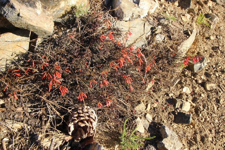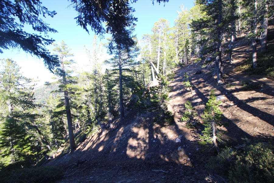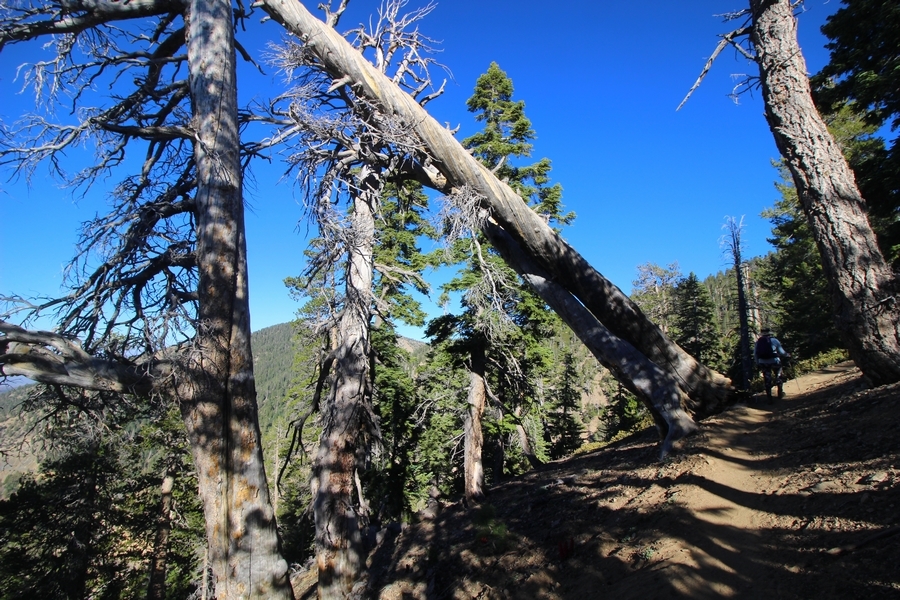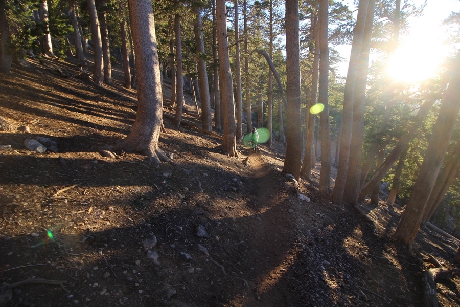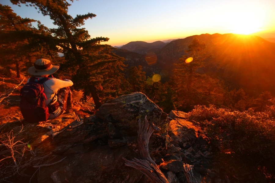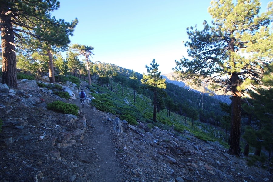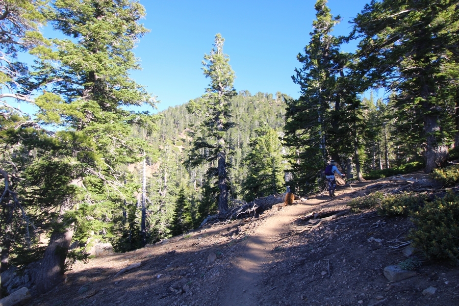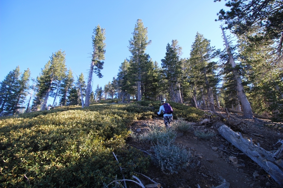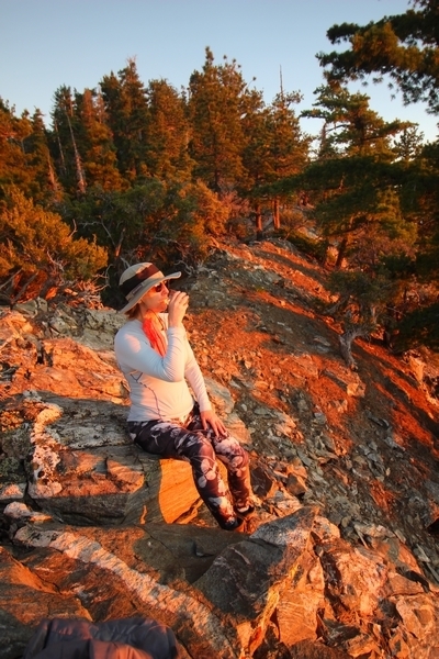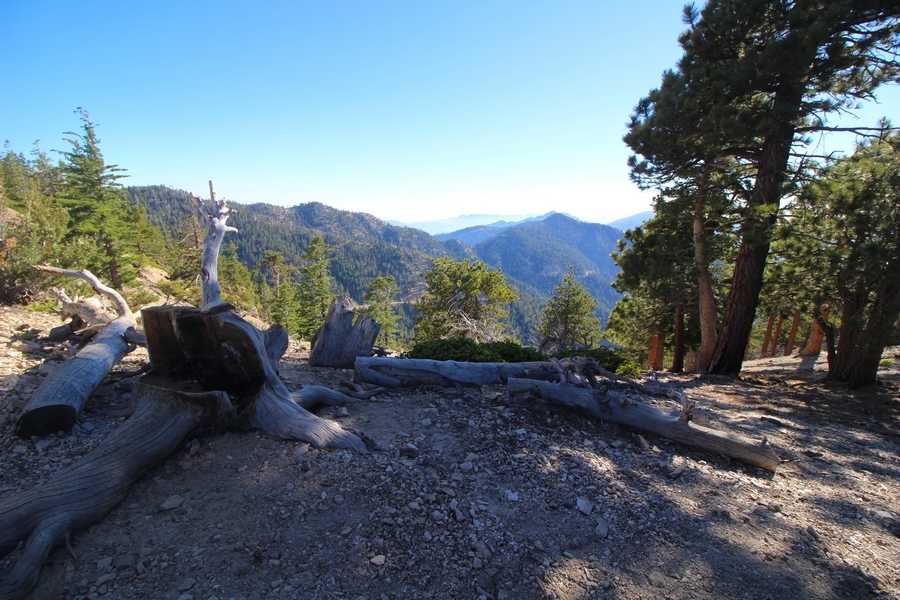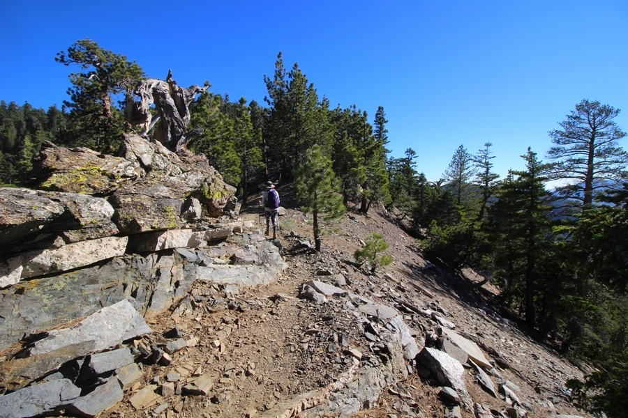 Given Chris’ questionable performance at Tyee Lakes the previous weekend, it wasn’t at all surprising that his personal trainer and life coach (one might hazard a guess as to who that is) immediately put him on a strenuous program of diet and exercise. Since it was Jane’s birthday, Chris humored her with a repeat of our last visit to Throop Peak in 2017 – our first idea here was to just walk up the ridge to where we could watch the sunset while Jane enjoyed a celebratory glass of wine, but we decided we could grab sandwiches at Jensen’s in Wrightwood and head first to the peak before returning to our sunset spot. Although really quite moderate, the trail up from Dawson Saddle always surprises with how much it seems to gain – Chris huffed and puffed his way up the ridgeline, but the pace was comfortable enough and we reached the summit 2 miles and 1,200 vertical feet later in a little over an hour. The evening weather was wonderful, sunny but with enough of a breeze to make Chris reach for his puffy once on top. Jane had brought a couple of mini-bottles of wine (in plastic bottles, no less), and she enjoyed her (first) birthday glass of chardonnay at 9,117′ of elevation. We still had about 90 minutes until sunset and Jane didn’t want to return to our watch spot and just sit, so she determined we should continue on down the crest to Mt. Hawkins – before Chris could comment, she was off, heading southwest down the use trail off the summit. We quickly reached the PCT and, following it southward, we reached a large and very dead ponderosa pine that had fallen lopsidedly across the trail – again, Jane was up and over the thing before Chris could protest that this obstacle might slow us down enough to miss the sunset. Once over the dead tree, we covered the remaining half-mile to Mt. Hawkins in about 10 minutes and, once there, spent about 30 seconds on the summit before Jane decided we had better hurry if we wanted to get back to watch the sunset (hmm). So, up the PCT we rushed, re-crossing over the deadfall and following the familiar trail east and north around Throop, rejoining the Dawson Saddle trail and continuing northward down the ridge. Now the choice became where to stop for the best sunset views – the highest spot on the ridge Chris had suggested would be great in the fall when the sun is further south in the sky, but now, while the sun would be setting over Mt. Williamson to the west, the view wasn’t so great from here. We picked up the pace again, hurrying down the trail another 1/4-mile to a rocky outcrop – arriving just at the golden hour, we got to see alpenglow catch all along the ridge followed by a clear, cloudless sunset. Afterward, we still had over a mile to get back to the car, and we actually used headlamps over the last few hundred yards back to the trailhead. Given the heat of the day this time of year, even in this area that’s relatively high elevation, the evening has gotten our attention as being an ideal time to hike.