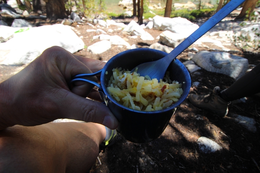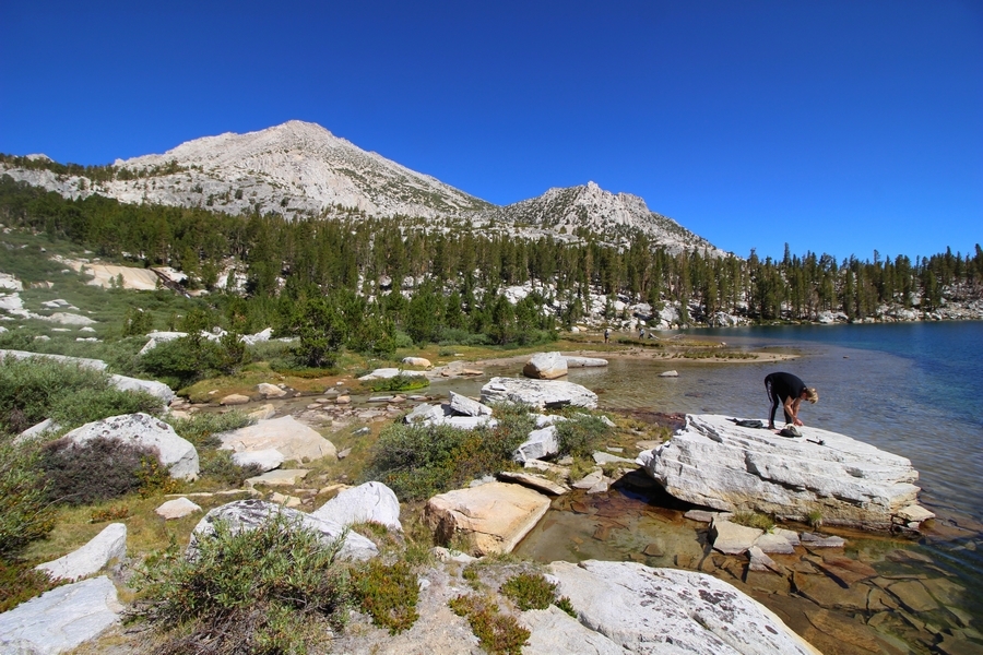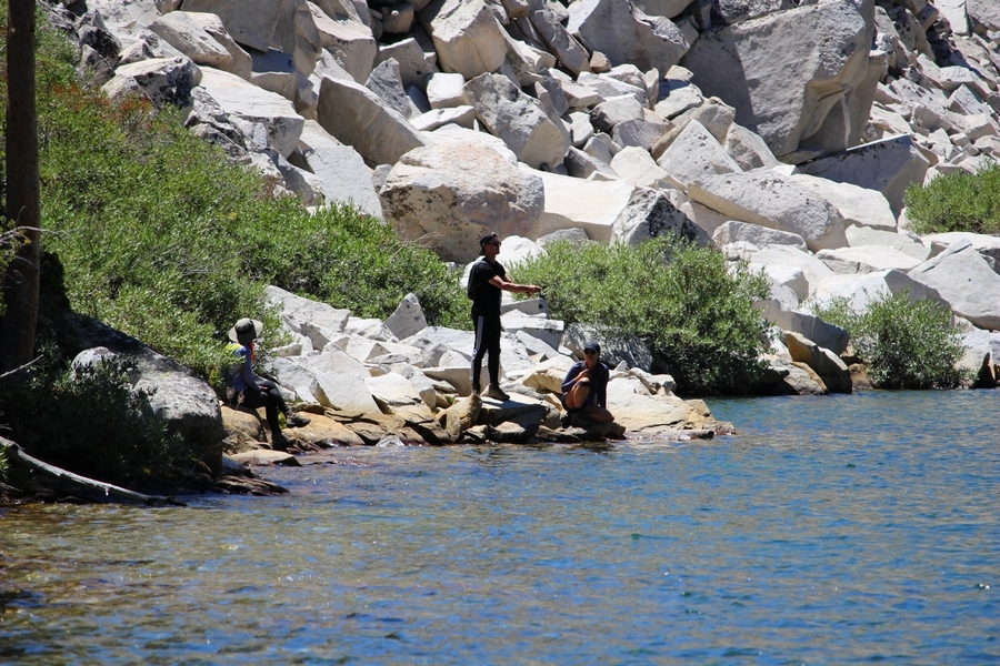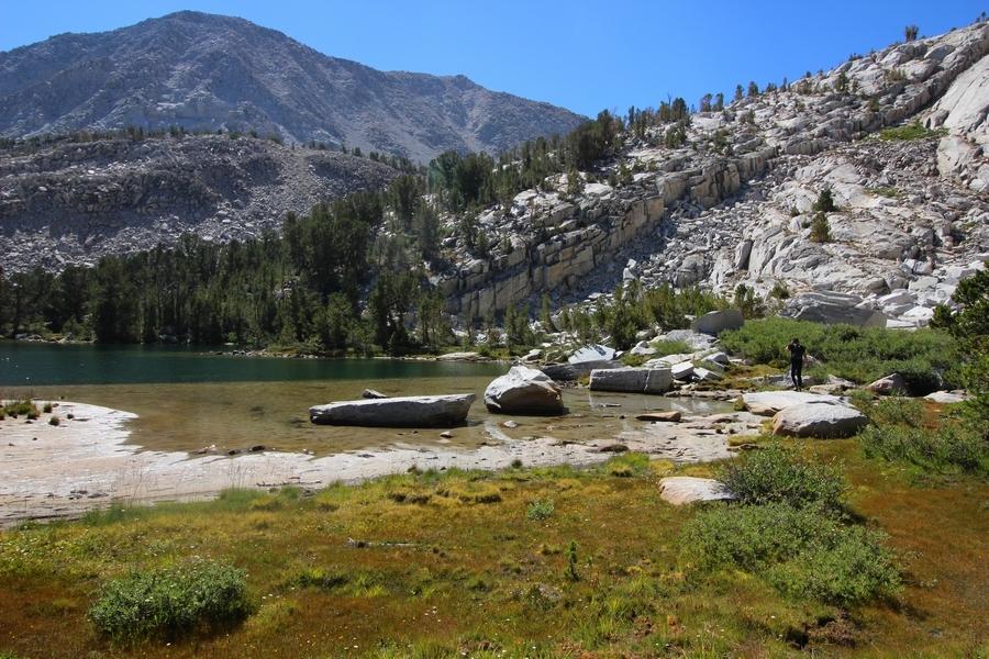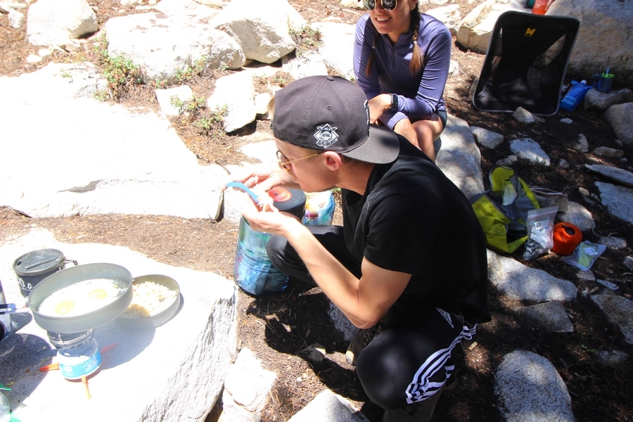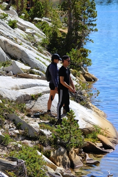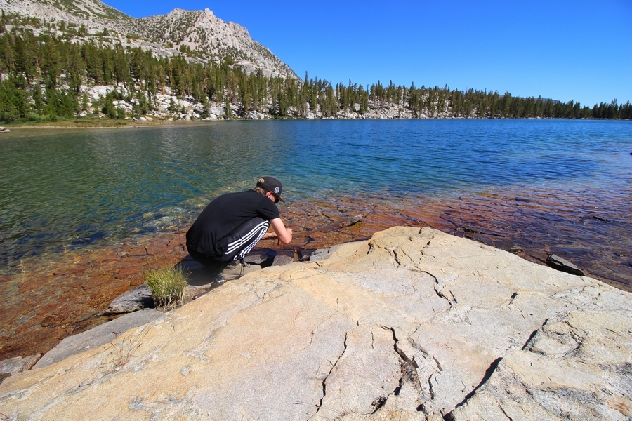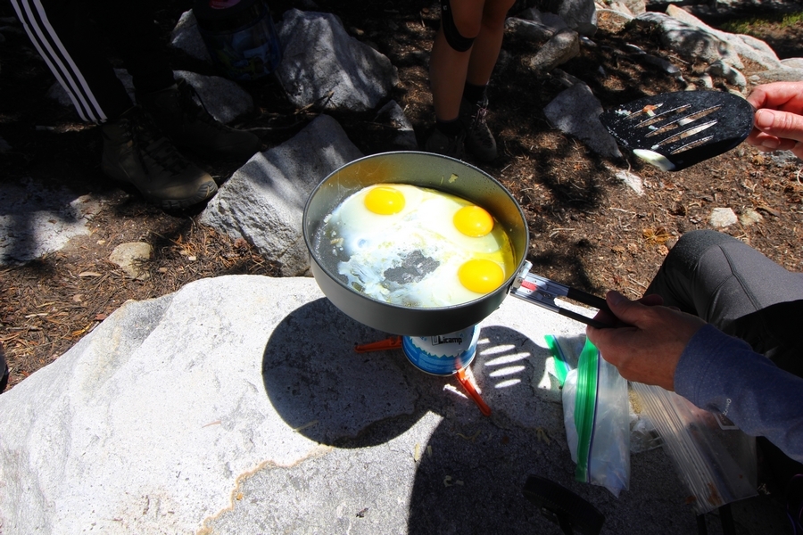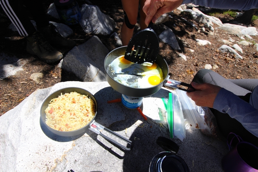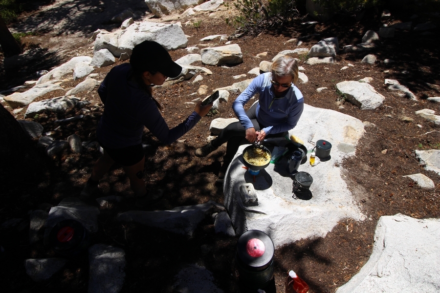 We woke up leisurely on Friday morning after not the most fitful sleep. It’s funny how sounds carry in the high country – the breeze on the lake water caused it to lap against the shoreline, and to us in our tent it sounded a lot like a large animal lapping up water from a dish, even from 30 yards away. Jane had a hard time getting to sleep, convinced she’d soon have an encounter with a bear. Despite our three bear canisters which should have offered plenty of space for toiletries and trash, we found very little room for such things and ended up hanging the extra smellables as high in nearby trees as we could reach, and this added to Jane’s anxiety. Of course, we had no such visitors, and the hanging items were untouched even by bugs or squirrels. We rose gradually through the morning, each getting our coffee and nibbling on light breakfast fare – Jane had threatened to make a giant breakfast with the eggs and dehydrated hash browns she’d brought, but we decided to wander about first and cook her grand meal a little later. Carter had woken up too late to cast for the several hundred fish Chris had seen jumping on the lake’s surface earlier, and he didn’t have much luck on bigger fish near our camp later in the morning – he decided we needed to find some deeper water, so we gathered some snacks together and began to wander westward along the lake shore. There was a use trail of sorts leading beyond our camp, a multi-braided track that sometimes kept to the higher ground away from the water and sometimes went down along its edge. Carter threw in casts all along the northwestern shore and caught a few smaller fish but none of the size he considered pan-worthy. Eventually, we scrambled up past a wonderful, large campsite and down a steep hillside to reach the sandy beach at the westernmost end of the lake – a cascade was visible above on Lake #4’s inlet creek, but Carter’s focus was on the fish and we continued southward across the grassy flats adjacent to the beach. As we crossed the inlet creek, some motion in the water caught Chris’ eye – there were a couple of dozen small trout schooling around in the shallow creek, not more than six inches deep, and they kept darting back and forth as we each came and looked at them from the bank above. We soon made our way to some rocks extending out from the shore to deeper water – this was Carter’s ticket, and he proceeded to settle in for a protracted stay. This was Chris’ cue to explore the slabs leading higher up the slope to the south – from camp, we had seen this ramp system leading about halfway up the canyon wall and had talked about possibly using this for a cross-country route to visit other lakes higher up in the basin. The slabs were steep in places but not too slick, and Chris found himself about 200′ above the water within about 5 minutes’ time. The elevated view was wonderful – the deep blue-green of the lake contrasting with the rust-colored rock in the shallows and the white and gray granite all round was the perfect high country picture. After a bit, Chris descended and we all proceeded to continue our circumnavigation – eastward up the shoreline was a short peninsula, and Carter fished here some more before we moved further east to the base of a jumble of boulders left at the bottom of another rocky drainage higher up. On the other side of the boulders was a brushy thicket, head-high with foliage – the route along the water looked sketchy to Chris, so he urged Jane to take the high route with him through some narrow openings in the flora. Ten minutes of tedious footing and loud cursing brought us out into the open, about the same time Dani and Carter appeared below, having taken the much easier path along the water – doh! Beyond the brush was more open forest, and the path was easily followed from here as we made our way north and west to complete the loop back at camp. Jane had been hoping for a fish lunch, but she broke out her breakfast goodies instead – she had packed her fresh eggs in a partial egg carton wrapped with insulation she’d cut from a freezer bag, and they were in perfect shape. Add a little oil, salt and pepper, the hash browns with bacon bits, and fried eggs, and we had a skillet meal fit for a big gathering at home – it was certainly not something Chris had seen in the backcountry since Boy Scout camp-outs many, many moons ago. The big lunch hit the spot, and we all took a break to refill water, change into lighter clothes (it was quite warm by this time), and rest a bit before heading out again for the afternoon’s excursion.