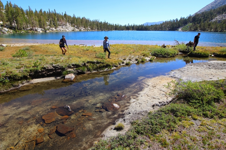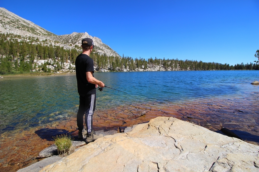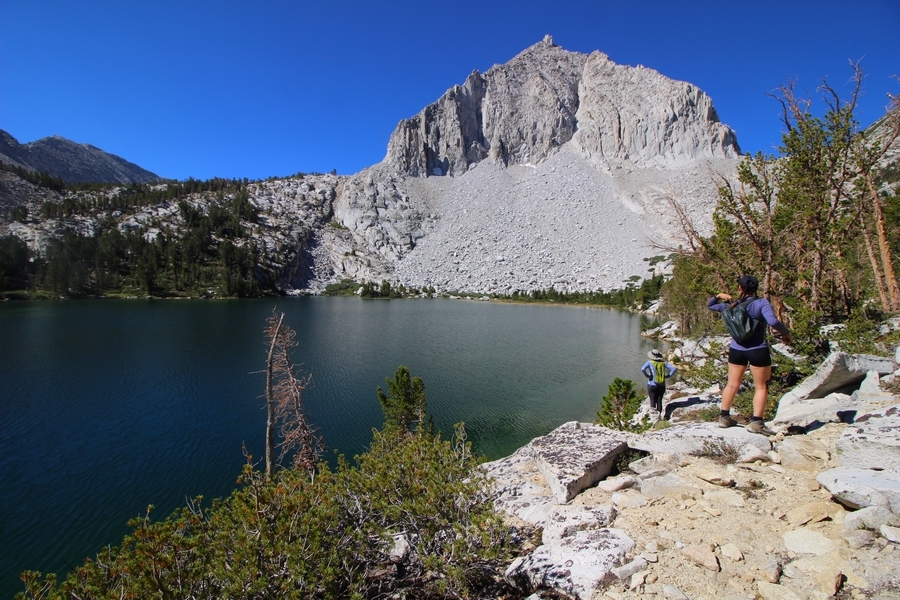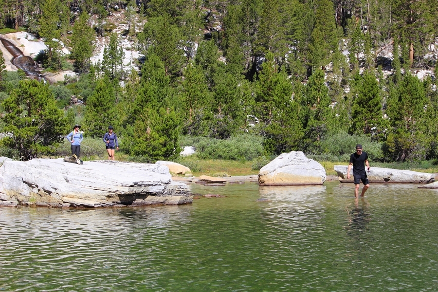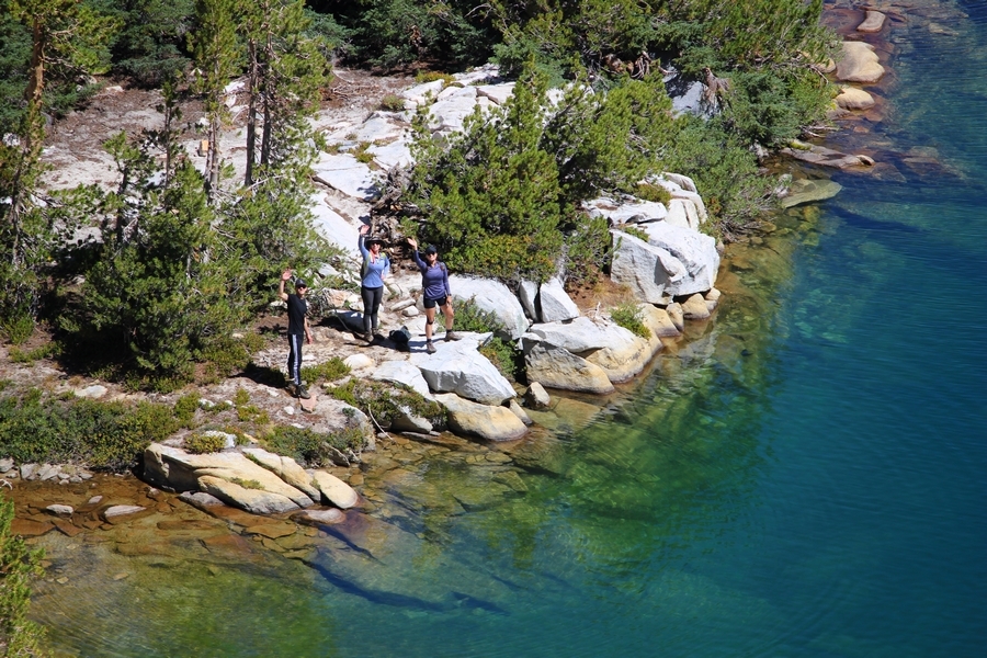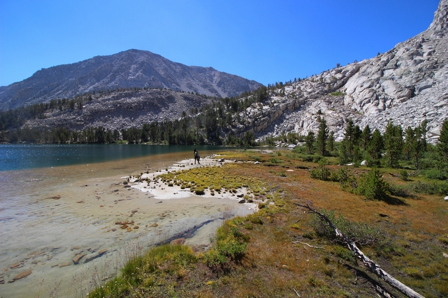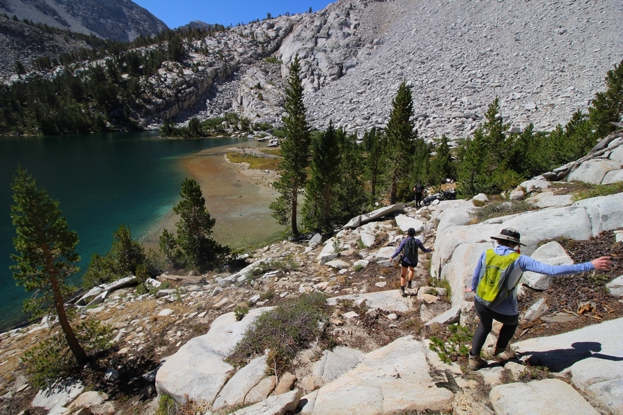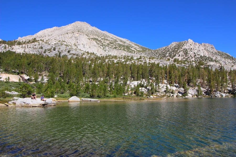 We woke up leisurely on Friday morning after not the most fitful sleep. It’s funny how sounds carry in the high country – the breeze on the lake water caused it to lap against the shoreline, and to us in our tent it sounded a lot like a large animal lapping up water from a dish, even from 30 yards away. Jane had a hard time getting to sleep, convinced she’d soon have an encounter with a bear. Despite our three bear canisters which should have offered plenty of space for toiletries and trash, we found very little room for such things and ended up hanging the extra smellables as high in nearby trees as we could reach, and this added to Jane’s anxiety. Of course, we had no such visitors, and the hanging items were untouched even by bugs or squirrels. We rose gradually through the morning, each getting our coffee and nibbling on light breakfast fare – Jane had threatened to make a giant breakfast with the eggs and dehydrated hash browns she’d brought, but we decided to wander about first and cook her grand meal a little later. Carter had woken up too late to cast for the several hundred fish Chris had seen jumping on the lake’s surface earlier, and he didn’t have much luck on bigger fish near our camp later in the morning – he decided we needed to find some deeper water, so we gathered some snacks together and began to wander westward along the lake shore. There was a use trail of sorts leading beyond our camp, a multi-braided track that sometimes kept to the higher ground away from the water and sometimes went down along its edge. Carter threw in casts all along the northwestern shore and caught a few smaller fish but none of the size he considered pan-worthy. Eventually, we scrambled up past a wonderful, large campsite and down a steep hillside to reach the sandy beach at the westernmost end of the lake – a cascade was visible above on Lake #4’s inlet creek, but Carter’s focus was on the fish and we continued southward across the grassy flats adjacent to the beach. As we crossed the inlet creek, some motion in the water caught Chris’ eye – there were a couple of dozen small trout schooling around in the shallow creek, not more than six inches deep, and they kept darting back and forth as we each came and looked at them from the bank above. We soon made our way to some rocks extending out from the shore to deeper water – this was Carter’s ticket, and he proceeded to settle in for a protracted stay. This was Chris’ cue to explore the slabs leading higher up the slope to the south – from camp, we had seen this ramp system leading about halfway up the canyon wall and had talked about possibly using this for a cross-country route to visit other lakes higher up in the basin. The slabs were steep in places but not too slick, and Chris found himself about 200′ above the water within about 5 minutes’ time. The elevated view was wonderful – the deep blue-green of the lake contrasting with the rust-colored rock in the shallows and the white and gray granite all round was the perfect high country picture. After a bit, Chris descended and we all proceeded to continue our circumnavigation – eastward up the shoreline was a short peninsula, and Carter fished here some more before we moved further east to the base of a jumble of boulders left at the bottom of another rocky drainage higher up. On the other side of the boulders was a brushy thicket, head-high with foliage – the route along the water looked sketchy to Chris, so he urged Jane to take the high route with him through some narrow openings in the flora. Ten minutes of tedious footing and loud cursing brought us out into the open, about the same time Dani and Carter appeared below, having taken the much easier path along the water – doh! Beyond the brush was more open forest, and the path was easily followed from here as we made our way north and west to complete the loop back at camp. Jane had been hoping for a fish lunch, but she broke out her breakfast goodies instead – she had packed her fresh eggs in a partial egg carton wrapped with insulation she’d cut from a freezer bag, and they were in perfect shape. Add a little oil, salt and pepper, the hash browns with bacon bits, and fried eggs, and we had a skillet meal fit for a big gathering at home – it was certainly not something Chris had seen in the backcountry since Boy Scout camp-outs many, many moons ago. The big lunch hit the spot, and we all took a break to refill water, change into lighter clothes (it was quite warm by this time), and rest a bit before heading out again for the afternoon’s excursion.