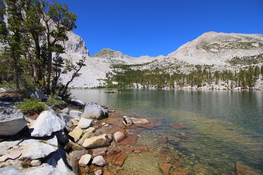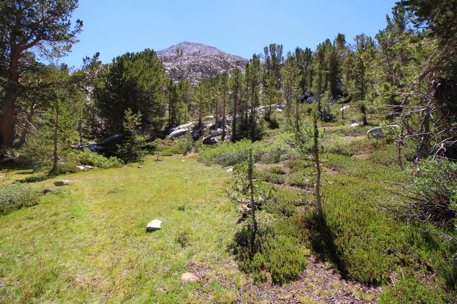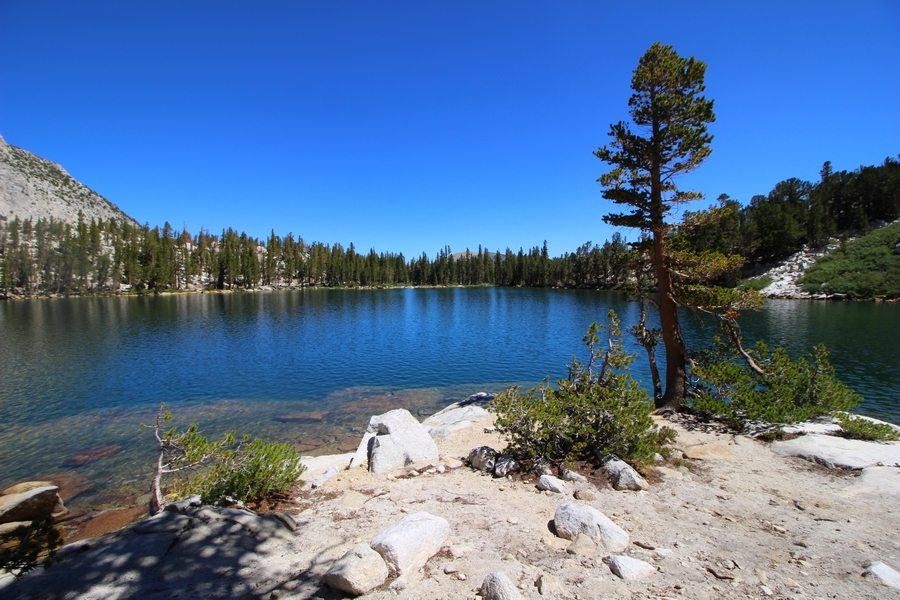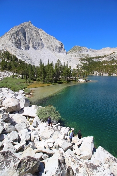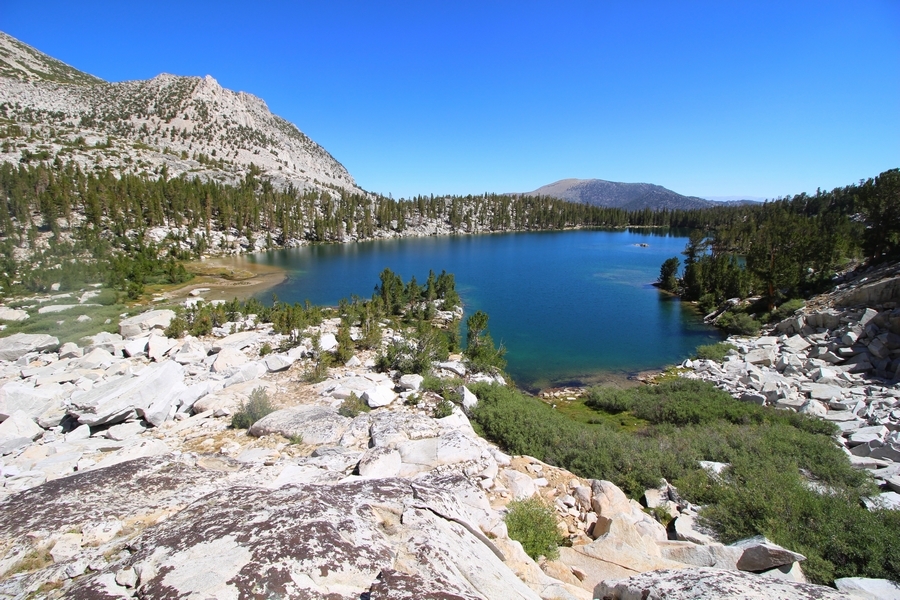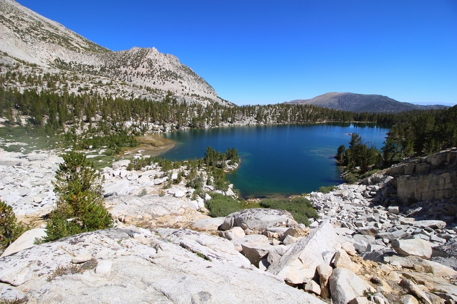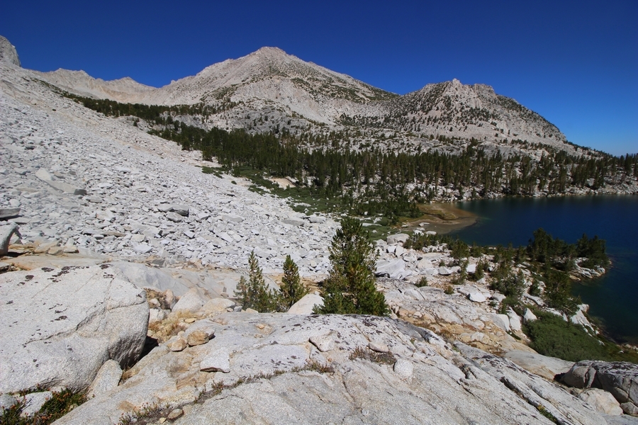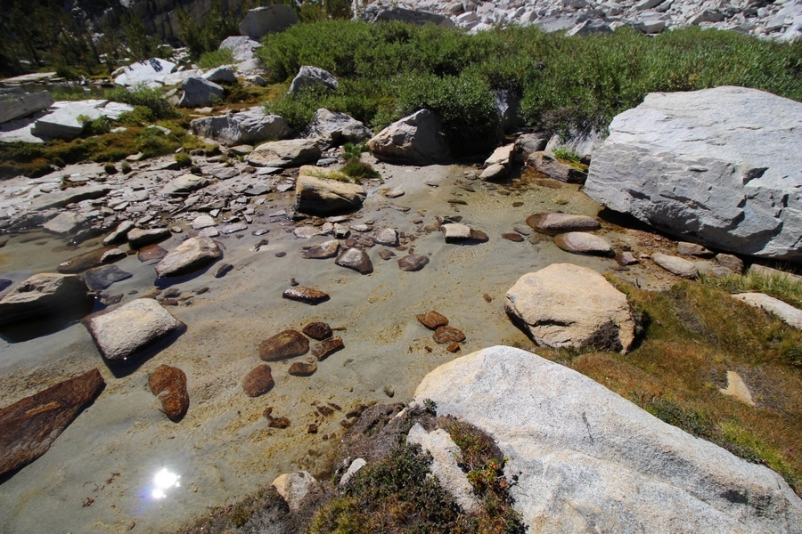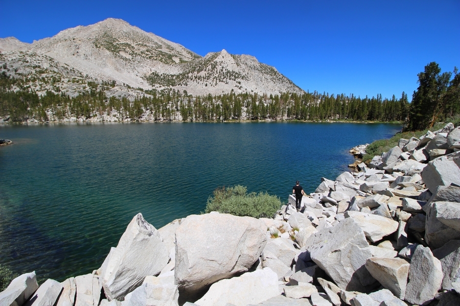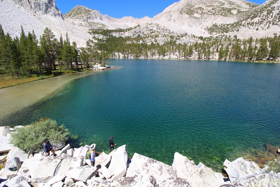 We woke up leisurely on Friday morning after not the most fitful sleep. It’s funny how sounds carry in the high country – the breeze on the lake water caused it to lap against the shoreline, and to us in our tent it sounded a lot like a large animal lapping up water from a dish, even from 30 yards away. Jane had a hard time getting to sleep, convinced she’d soon have an encounter with a bear. Despite our three bear canisters which should have offered plenty of space for toiletries and trash, we found very little room for such things and ended up hanging the extra smellables as high in nearby trees as we could reach, and this added to Jane’s anxiety. Of course, we had no such visitors, and the hanging items were untouched even by bugs or squirrels. We rose gradually through the morning, each getting our coffee and nibbling on light breakfast fare – Jane had threatened to make a giant breakfast with the eggs and dehydrated hash browns she’d brought, but we decided to wander about first and cook her grand meal a little later. Carter had woken up too late to cast for the several hundred fish Chris had seen jumping on the lake’s surface earlier, and he didn’t have much luck on bigger fish near our camp later in the morning – he decided we needed to find some deeper water, so we gathered some snacks together and began to wander westward along the lake shore. There was a use trail of sorts leading beyond our camp, a multi-braided track that sometimes kept to the higher ground away from the water and sometimes went down along its edge. Carter threw in casts all along the northwestern shore and caught a few smaller fish but none of the size he considered pan-worthy. Eventually, we scrambled up past a wonderful, large campsite and down a steep hillside to reach the sandy beach at the westernmost end of the lake – a cascade was visible above on Lake #4’s inlet creek, but Carter’s focus was on the fish and we continued southward across the grassy flats adjacent to the beach. As we crossed the inlet creek, some motion in the water caught Chris’ eye – there were a couple of dozen small trout schooling around in the shallow creek, not more than six inches deep, and they kept darting back and forth as we each came and looked at them from the bank above. We soon made our way to some rocks extending out from the shore to deeper water – this was Carter’s ticket, and he proceeded to settle in for a protracted stay. This was Chris’ cue to explore the slabs leading higher up the slope to the south – from camp, we had seen this ramp system leading about halfway up the canyon wall and had talked about possibly using this for a cross-country route to visit other lakes higher up in the basin. The slabs were steep in places but not too slick, and Chris found himself about 200′ above the water within about 5 minutes’ time. The elevated view was wonderful – the deep blue-green of the lake contrasting with the rust-colored rock in the shallows and the white and gray granite all round was the perfect high country picture. After a bit, Chris descended and we all proceeded to continue our circumnavigation – eastward up the shoreline was a short peninsula, and Carter fished here some more before we moved further east to the base of a jumble of boulders left at the bottom of another rocky drainage higher up. On the other side of the boulders was a brushy thicket, head-high with foliage – the route along the water looked sketchy to Chris, so he urged Jane to take the high route with him through some narrow openings in the flora. Ten minutes of tedious footing and loud cursing brought us out into the open, about the same time Dani and Carter appeared below, having taken the much easier path along the water – doh! Beyond the brush was more open forest, and the path was easily followed from here as we made our way north and west to complete the loop back at camp. Jane had been hoping for a fish lunch, but she broke out her breakfast goodies instead – she had packed her fresh eggs in a partial egg carton wrapped with insulation she’d cut from a freezer bag, and they were in perfect shape. Add a little oil, salt and pepper, the hash browns with bacon bits, and fried eggs, and we had a skillet meal fit for a big gathering at home – it was certainly not something Chris had seen in the backcountry since Boy Scout camp-outs many, many moons ago. The big lunch hit the spot, and we all took a break to refill water, change into lighter clothes (it was quite warm by this time), and rest a bit before heading out again for the afternoon’s excursion.