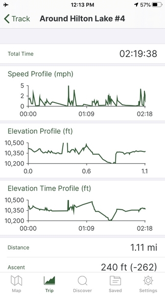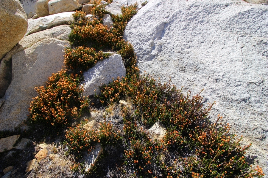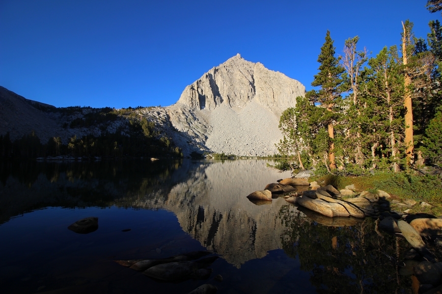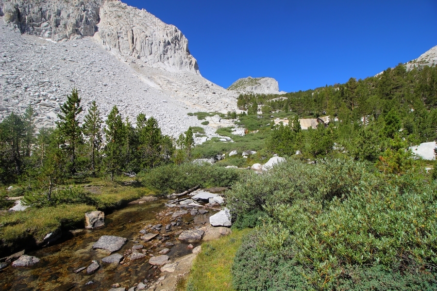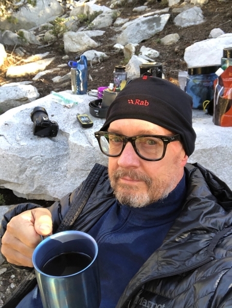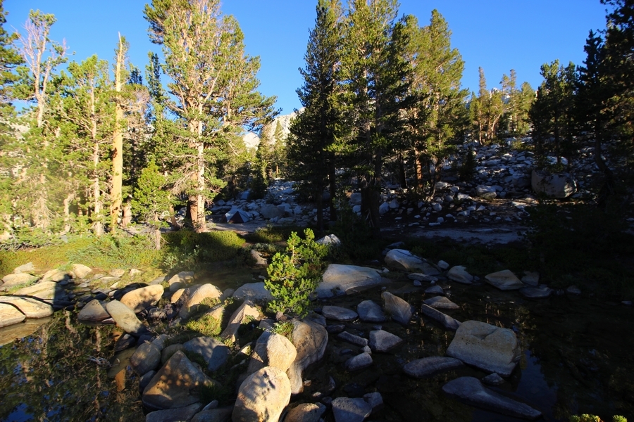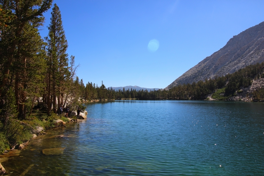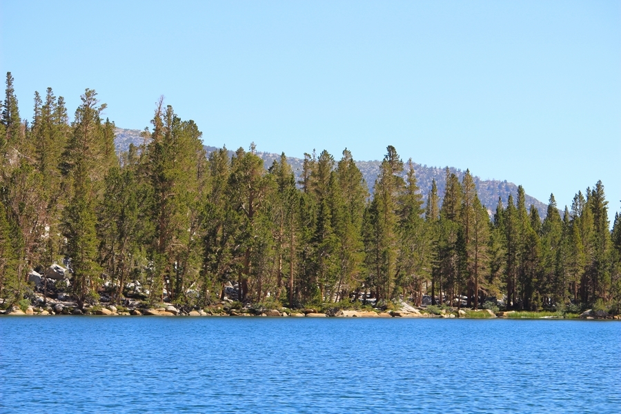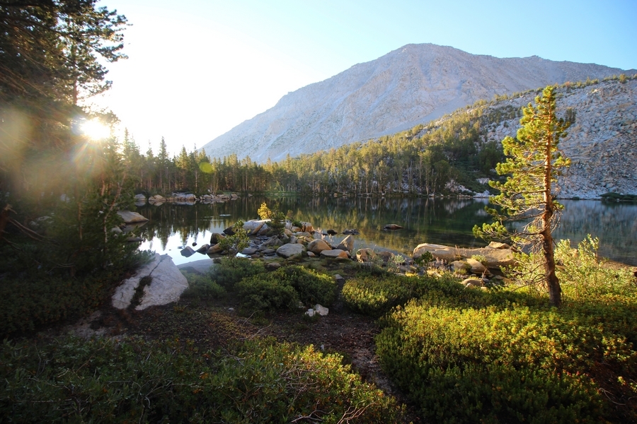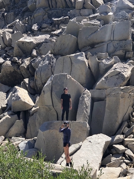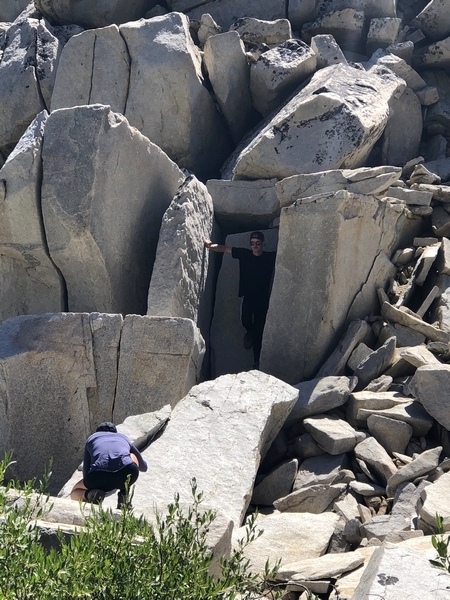 We woke up leisurely on Friday morning after not the most fitful sleep. It’s funny how sounds carry in the high country – the breeze on the lake water caused it to lap against the shoreline, and to us in our tent it sounded a lot like a large animal lapping up water from a dish, even from 30 yards away. Jane had a hard time getting to sleep, convinced she’d soon have an encounter with a bear. Despite our three bear canisters which should have offered plenty of space for toiletries and trash, we found very little room for such things and ended up hanging the extra smellables as high in nearby trees as we could reach, and this added to Jane’s anxiety. Of course, we had no such visitors, and the hanging items were untouched even by bugs or squirrels. We rose gradually through the morning, each getting our coffee and nibbling on light breakfast fare – Jane had threatened to make a giant breakfast with the eggs and dehydrated hash browns she’d brought, but we decided to wander about first and cook her grand meal a little later. Carter had woken up too late to cast for the several hundred fish Chris had seen jumping on the lake’s surface earlier, and he didn’t have much luck on bigger fish near our camp later in the morning – he decided we needed to find some deeper water, so we gathered some snacks together and began to wander westward along the lake shore. There was a use trail of sorts leading beyond our camp, a multi-braided track that sometimes kept to the higher ground away from the water and sometimes went down along its edge. Carter threw in casts all along the northwestern shore and caught a few smaller fish but none of the size he considered pan-worthy. Eventually, we scrambled up past a wonderful, large campsite and down a steep hillside to reach the sandy beach at the westernmost end of the lake – a cascade was visible above on Lake #4’s inlet creek, but Carter’s focus was on the fish and we continued southward across the grassy flats adjacent to the beach. As we crossed the inlet creek, some motion in the water caught Chris’ eye – there were a couple of dozen small trout schooling around in the shallow creek, not more than six inches deep, and they kept darting back and forth as we each came and looked at them from the bank above. We soon made our way to some rocks extending out from the shore to deeper water – this was Carter’s ticket, and he proceeded to settle in for a protracted stay. This was Chris’ cue to explore the slabs leading higher up the slope to the south – from camp, we had seen this ramp system leading about halfway up the canyon wall and had talked about possibly using this for a cross-country route to visit other lakes higher up in the basin. The slabs were steep in places but not too slick, and Chris found himself about 200′ above the water within about 5 minutes’ time. The elevated view was wonderful – the deep blue-green of the lake contrasting with the rust-colored rock in the shallows and the white and gray granite all round was the perfect high country picture. After a bit, Chris descended and we all proceeded to continue our circumnavigation – eastward up the shoreline was a short peninsula, and Carter fished here some more before we moved further east to the base of a jumble of boulders left at the bottom of another rocky drainage higher up. On the other side of the boulders was a brushy thicket, head-high with foliage – the route along the water looked sketchy to Chris, so he urged Jane to take the high route with him through some narrow openings in the flora. Ten minutes of tedious footing and loud cursing brought us out into the open, about the same time Dani and Carter appeared below, having taken the much easier path along the water – doh! Beyond the brush was more open forest, and the path was easily followed from here as we made our way north and west to complete the loop back at camp. Jane had been hoping for a fish lunch, but she broke out her breakfast goodies instead – she had packed her fresh eggs in a partial egg carton wrapped with insulation she’d cut from a freezer bag, and they were in perfect shape. Add a little oil, salt and pepper, the hash browns with bacon bits, and fried eggs, and we had a skillet meal fit for a big gathering at home – it was certainly not something Chris had seen in the backcountry since Boy Scout camp-outs many, many moons ago. The big lunch hit the spot, and we all took a break to refill water, change into lighter clothes (it was quite warm by this time), and rest a bit before heading out again for the afternoon’s excursion.