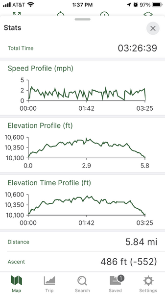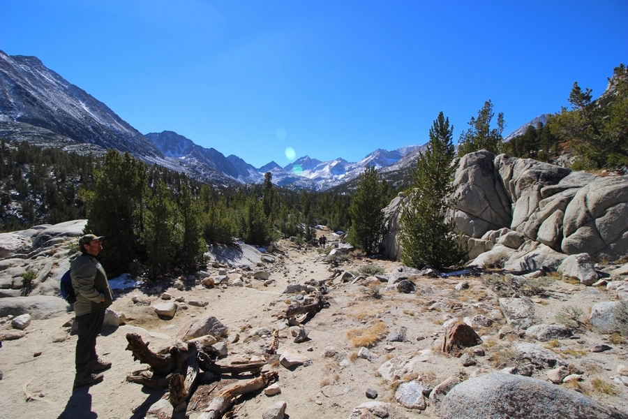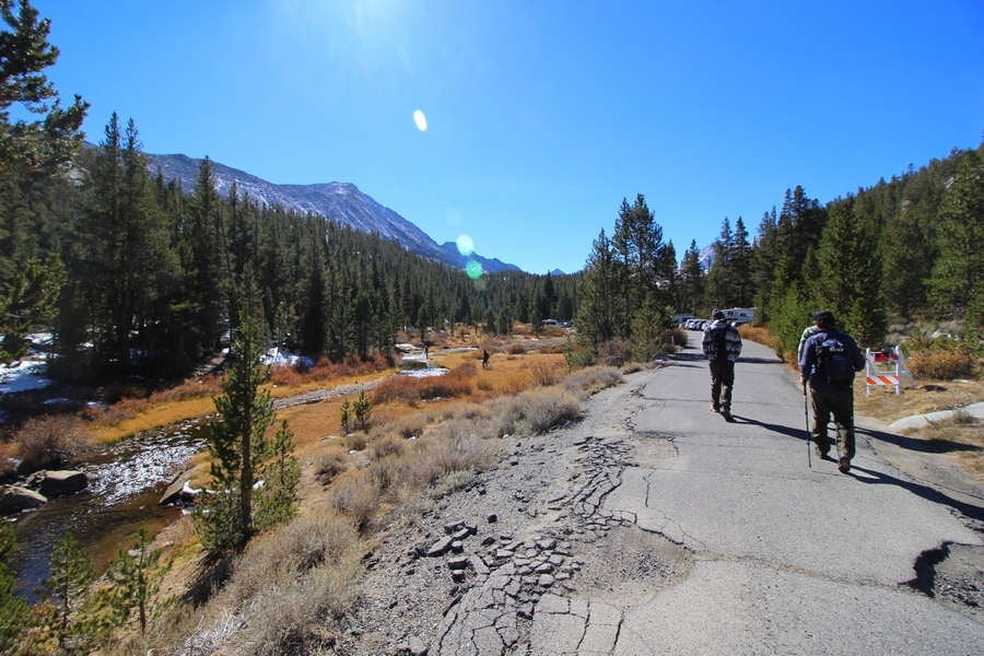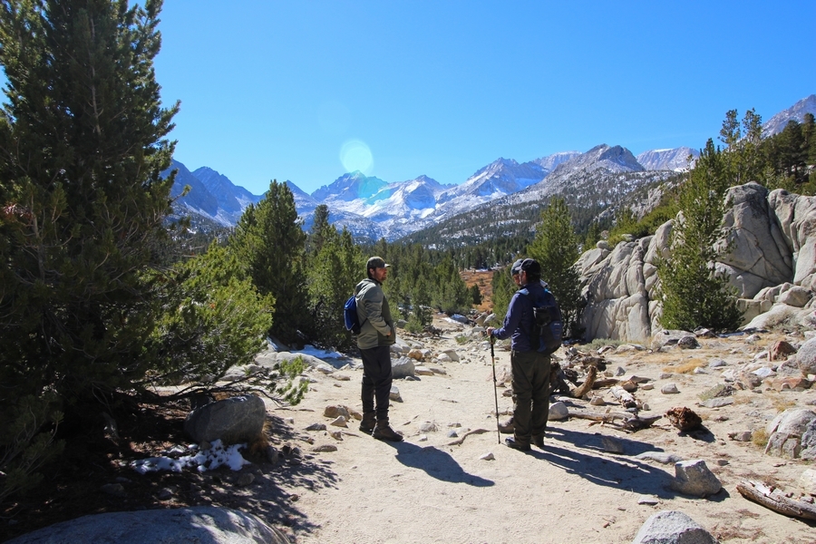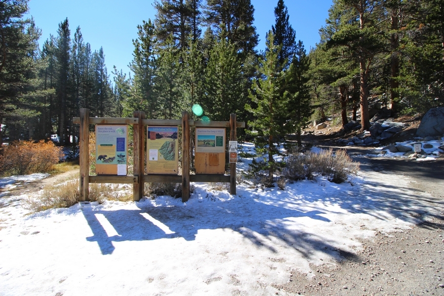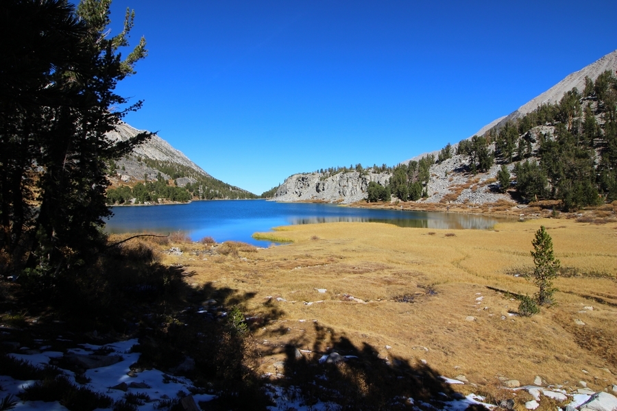 Saturday of our weekend camping trip near Bishop found us shaking off the chilly morning in camp with coffee and a light breakfast, followed by a drive into Bishop where we stopped at Schaat’s to get some lunch for the trail. Today’s destination was Little Lakes Valley, where Chris, Jane, and Pedro had done a warm-up hike in 2018 before visiting a couple of the High Sierra camps in Yosemite. The trailhead at Mosquito Flats lies at 10,250′, and the main trail leads southward up the valley gaining only 900′ over 3-1/2 miles – easy access to high-elevation alpine areas for sure. We didn’t get to the TH until 11:00am, and the main parking area was packed full. We backtracked down the access road, eventually finding a pair of spots about 4/10ths of a mile away, adding a short bit of distance to the trip. Dusty decided to leave Apollo in the well-ventilated comfort of the SUV, and we started walking southward up the road, reaching the trailhead shortly thereafter. Up the gentle valley we went, passing Mack, Marsh, Heart, and Box Lakes in turn. The views were wonderful, although we realized the fall colors had peaked a few weeks earlier. Pedro’s feet were hurting a bit today, so we stopped at the south end of Long Lake, traversing westward on a use trail through some old snow to a shady spot overlooking the lake. Here we ate lunch and spent about 30 minutes before starting back – the return trip was uneventful, save for the beautiful valley and mountain views that kept us constantly turning around to enjoy. Apollo was overjoyed to see us upon our arrival at the cars, and we stopped again in Bishop for pizza (and at Eastside Sports to pick up warmer gloves for Pedro) which we ate back at our campsite. This was a fun trip, for each of us our first visit to the eastern Sierra this time of year, and we’ll see if it becomes something of an annual event.