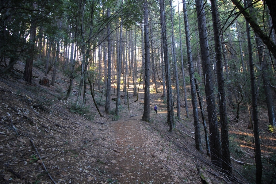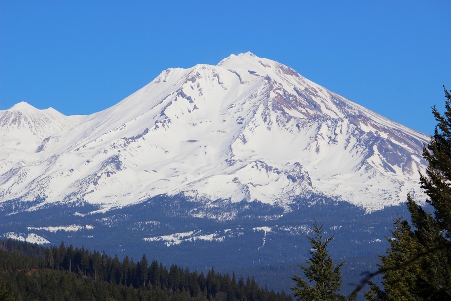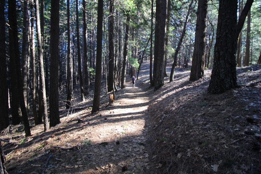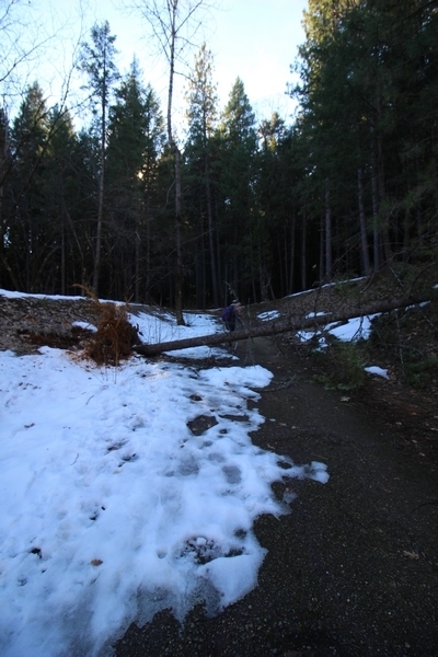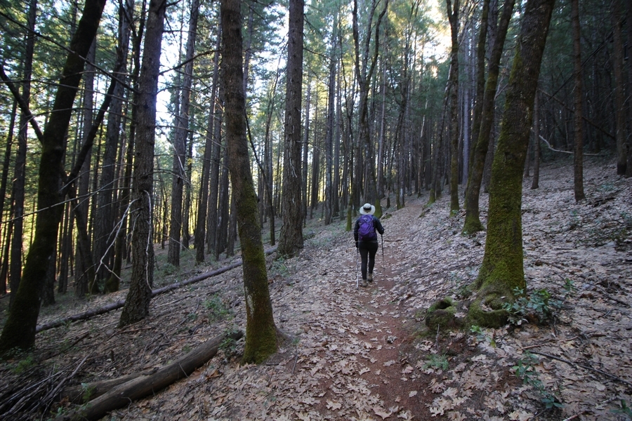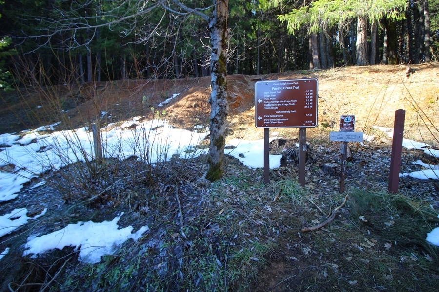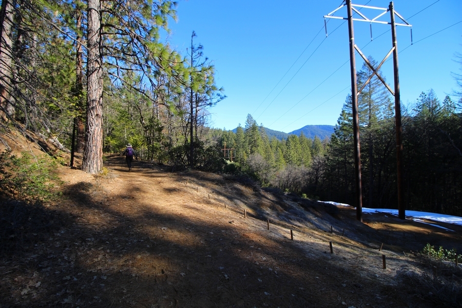 Chris’ mom, who lives in the Seattle area, was having a medical procedure in late January, so we decided to make the drive up north to help her get settled through her recovery. We made the trip in semi-leisurely fashion, spending a couple of nights at hotels along the I-5 corridor on the way. Our first night was spent in the Sacramento Valley town of Willows, and this fine Saturday morning saw us rise reasonably early and drive roughly two hours northward to the Soda Springs trailhead, where the PCT crosses I-5 near Dunsmuir. The trailhead lies adjacent to Castle Crags State Park, and our original plan was to hike the PCT west and south into the park, then follow the steep park trail up to Castle Dome, one of the area’s most notable features. There were a couple of vehicles in the gravel parking area when we arrived about 10:30am, some old snow and ice covering the initial parts of the trail that was quite slippery in the chilly shade as we started out. The trail immediately starts southward above the freeway, increasing its gradient quite sharply for 200 vertical feet until it reaches an old logging road, where it turns west and begins a mile-long traverse that is virtually level. Near the end of the traverse, the trail bears northward for a short distance before doubling back south, leaving the old road in favor of a pretty singletrack that gently ascends to the level of the ridgeline immediately to the south. As we met the ridge, we arrived at the turnoff for Castle Dome, but we’d decided at this point to forgo the steep (and, we thought, icy) 2,000′ climb. Instead, we followed the trail eastward to the park’s upper parking lot and viewpoint, where we found the only other people we’d see on the hike, admiring the views west to the crags and northeast to Mt. Shasta. We had considered retracing our steps back to the car, but we saw an alternate route on our map marked as the Kettlebelly trail, that would drop us south off the ridgeline and loop back around to the east and north where we could again pick up the PCT. This section was the prettiest of the loop, sunny now where most of the ascent had been in deep shade. Once we’d regained the PCT, it was a short hop down the hill to the trailhead. In total, we spent just under two hours on the route covering about 5 miles with maybe 500′ of total elevation gain (the GPS mistakenly captured a non-existent descent/ascent in the first half of the hike). The only casualties of the day were Chris’ trekking poles, which he apparently left leaning on the Explorer before driving off, an error he would not discover until the following morning when we were several hundred miles north near Salem, OR (we did stop here a couple of weeks later to see if maybe someone had found and stashed them somewhere, but no such luck). There are other options for short loop trips from the Soda Creek TH that make for a great way to stretch one’s legs and break up a long drive, so maybe we’ll get back to Castle Crags at some point, ideally with some warmer weather.
