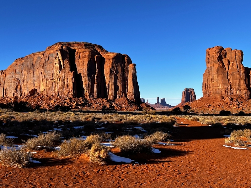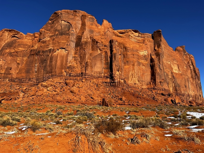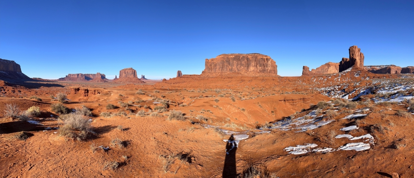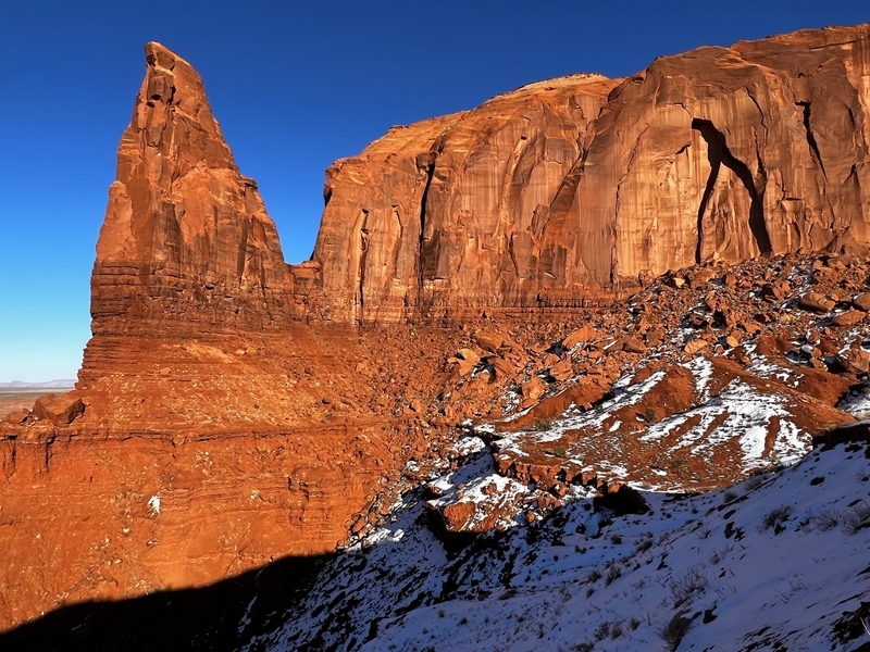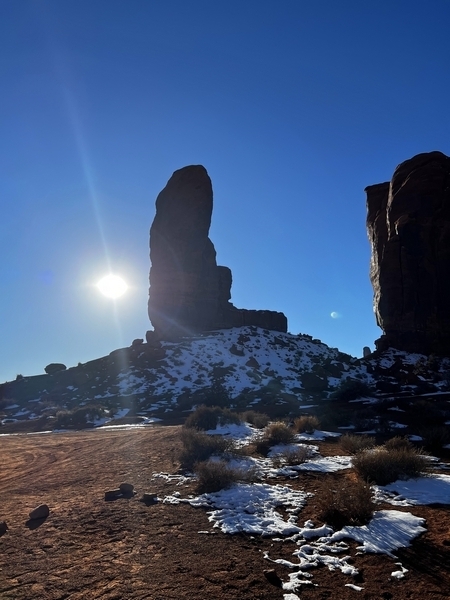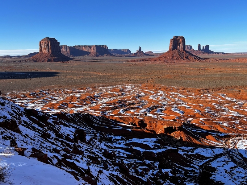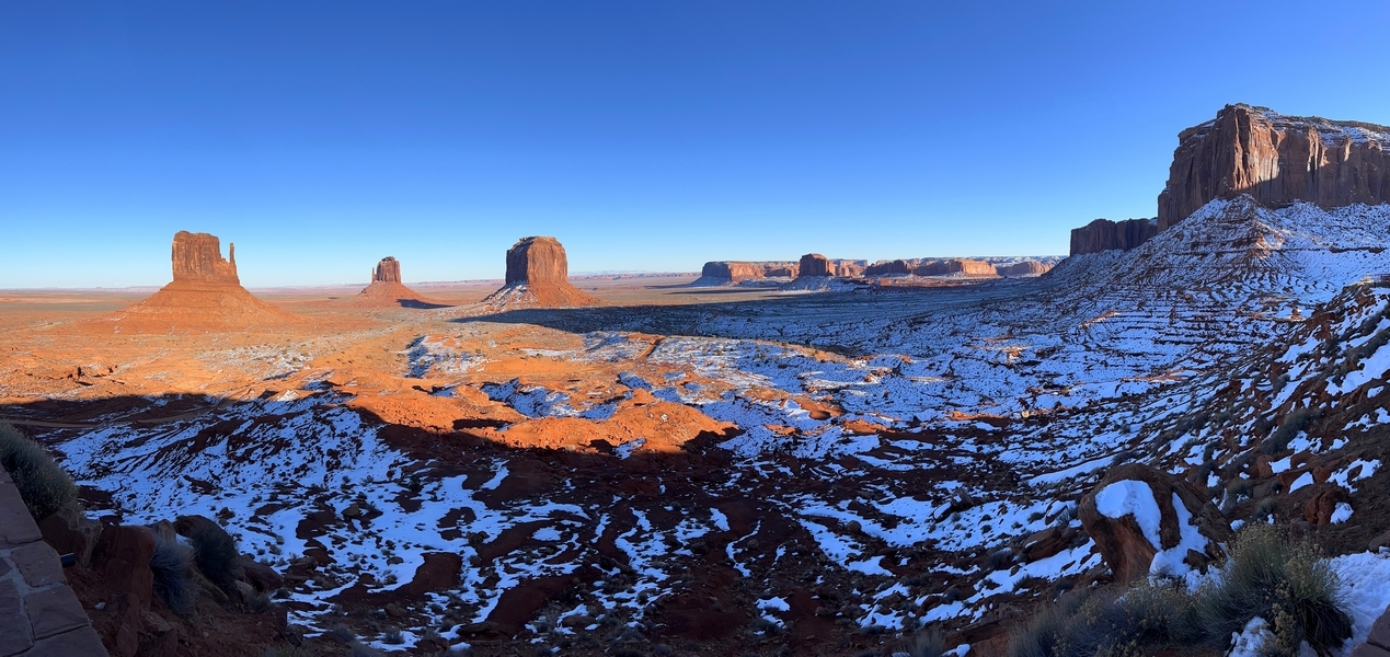 Chris started working on a new project last fall, which required him to make a trip to the field location in southeastern Utah near Four Corners. Jane tagged along, and we hoped to get some time to see sights in the area. After spending the night in Kingman AZ, we got an early start and drove to Monument Valley, crossing briefly into Utah before entering the Navajo Tribal Park just back across the state line in Arizona. It was a beautiful, crisp day with some snow on the ground, which made the spectacular scenery all the more impressive. We had considered doing a short hike from the visitor center out toward the West Mitten, but the muddy trail conditions compelled us to do the 17-Mile Drive in the truck instead. We spent the next couple of hours navigating the slippery road as it weaves around and through the red rock formations, stopping frequently for photos and absorbing the grandeur and vastness of the area. Once we completed the loop, we stopped momentarily at the visitor center before heading further east on the highway to Forrest Gump Point, where one of the movie’s most famous shots was filmed. The January early sunset was near as we resumed the drive eastward through the San Juan River drainage, eventually reaching Cortez CO and a surprisingly-delicious burger at Denny’s. So happy to have made this very worthwhile side trip.